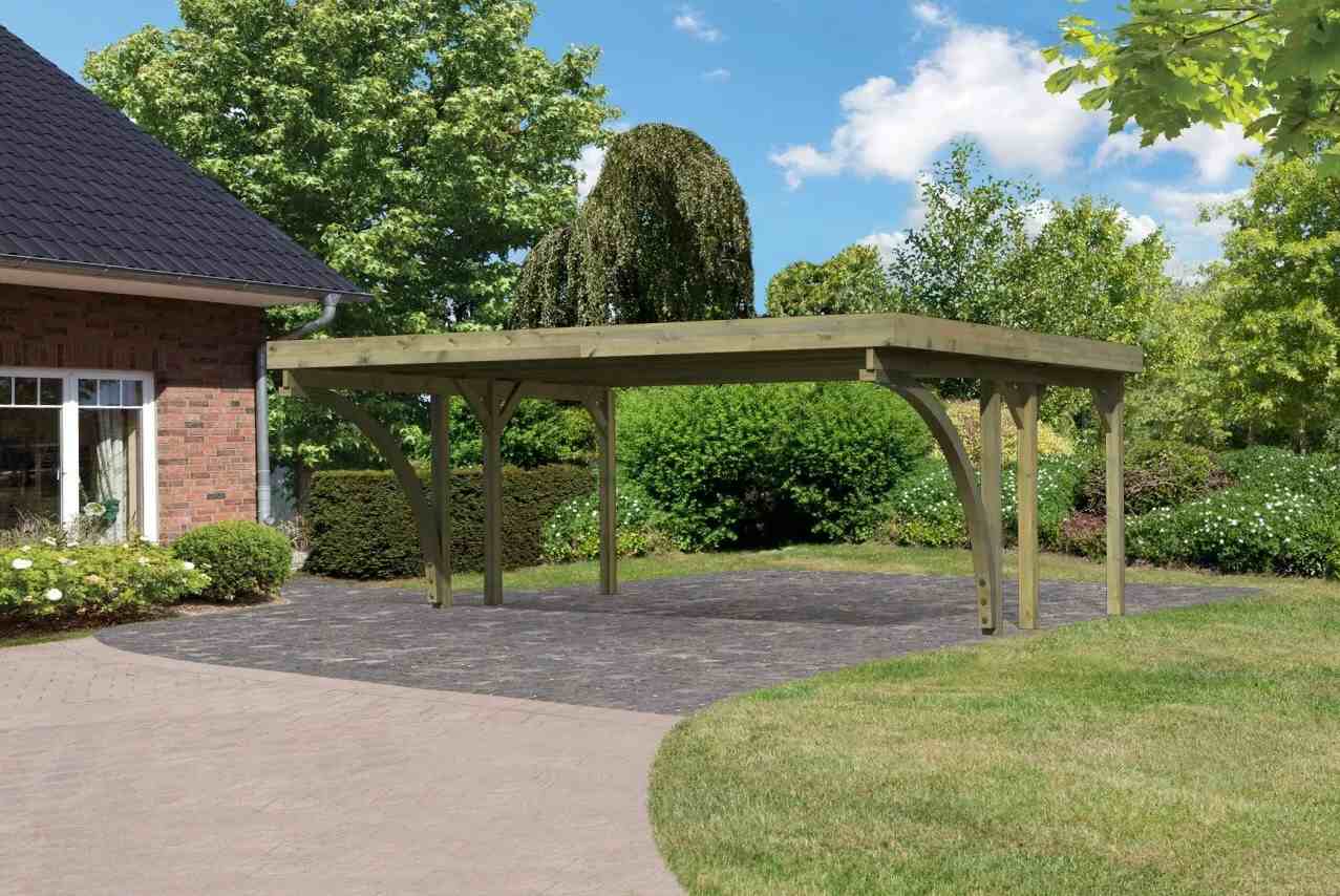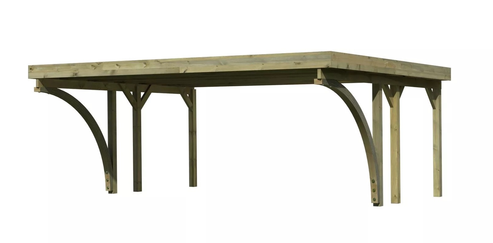 Přístřešek na auto - obdélníkový tvar a svými rozměry vyhovuje většině modelů vozidel běžných na českém trhu. Celková zastřešená plocha je 5,98 x 4,80 m. Průjezdná výška je 206 cm. Střechu podpírá šest dřevěných sloupků 11,5 x 11,5 cm. Konstrukce přístřešku je tlakově impregnována a je tak dobře chráněna proti dřevokazným houbám i hmyzu, ale i proti nepříznivým povětrnostním podmínkám. Impregnace je zdravotně nezávadná a naprosto bezpečná. Vzhledem k velkým plochám střechy a zatížení větrem je nutné připevnit přístřešek k zemi pomocí odpovídajících zemních kotev (nejsou obsahem dodávky - lze dokoupit jako příplatkové příslušenství).
