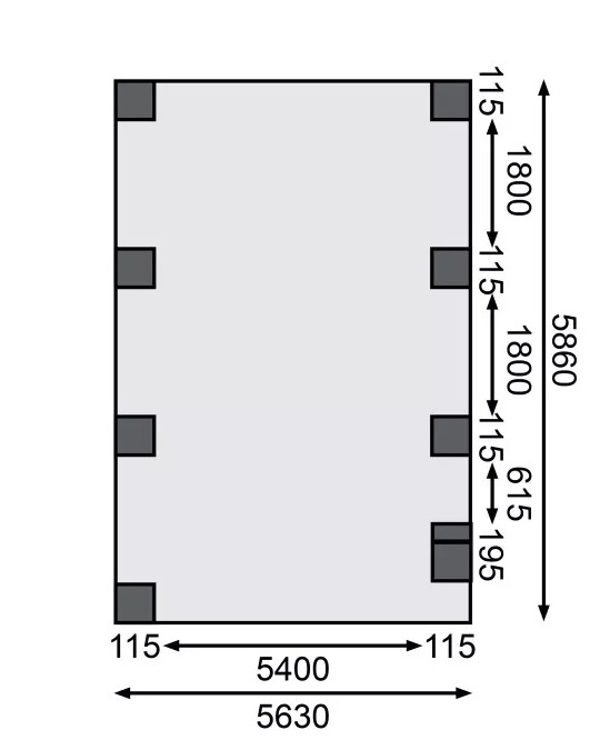 Přístřešek na auto - obdélníkový tvar a svými rozměry vyhovuje většině modelů vozidel běžných na českém trhu. Celková zastřešená plocha je 5,98 x 6,70 m. Průjezdná výška je 206 cm. Střechu podpírá osm dřevěných sloupků 11,5 x 11,5 cm. Konstrukce přístřešku je tlakově impregnována a je tak dobře chráněna proti dřevokazným houbám i hmyzu, ale i proti nepříznivým povětrnostním podmínkám. Impregnace je zdravotně nezávadná a naprosto bezpečná. Vzhledem k velkým plochám střechy a zatížení větrem je nutné připevnit přístřešek k zemi pomocí odpovídajících zemních kotev (nejsou obsahem dodávky - lze dokoupit jako příplatkové příslušenství).