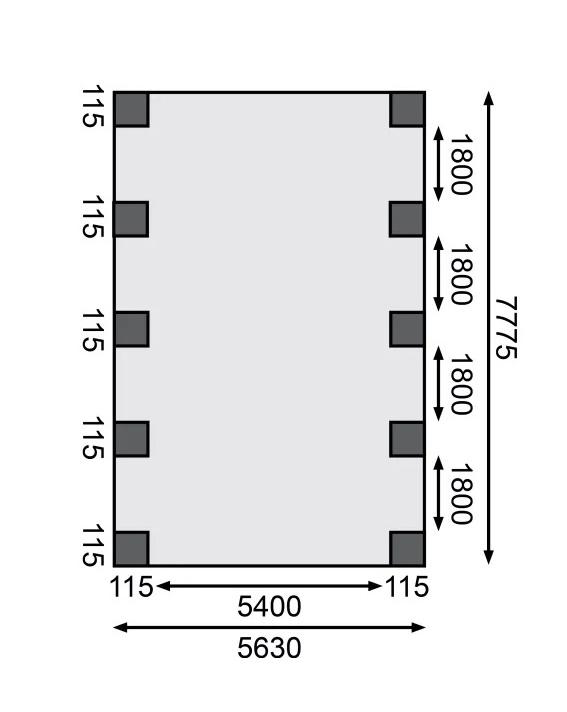 Přístřešek na auto - obdélníkový tvar a svými rozměry vyhovuje většině modelů vozidel běžných na českém trhu. Celková zastřešená plocha je 5,98 x 8,60 m. Průjezdná výška je 206 cm. Střechu podpírá deset dřevěných sloupků 11,5 x 11,5 cm. Konstrukce přístřešku je tlakově impregnována a je tak dobře chráněna proti dřevokazným houbám i hmyzu, ale i proti nepříznivým povětrnostním podmínkám. Impregnace je zdravotně nezávadná a naprosto bezpečná. Vzhledem k velkým plochám střechy a zatížení větrem je nutné připevnit přístřešek k zemi pomocí odpovídajících zemních kotev (nejsou obsahem dodávky - lze dokoupit jako příplatkové příslušenství).