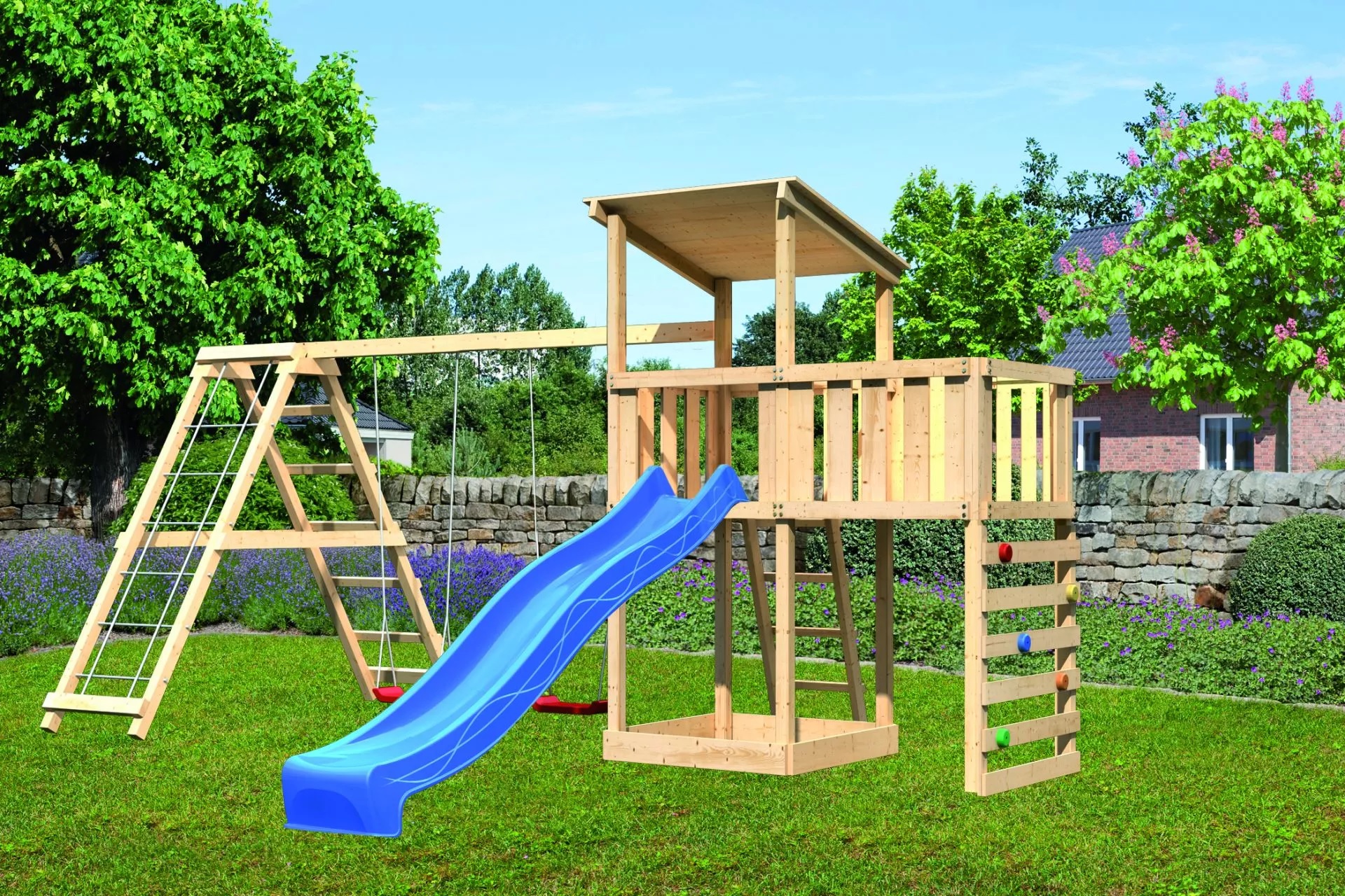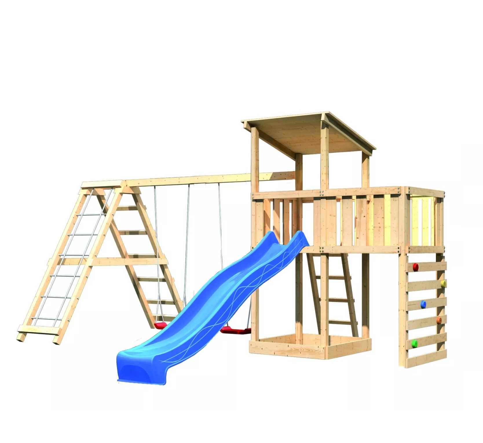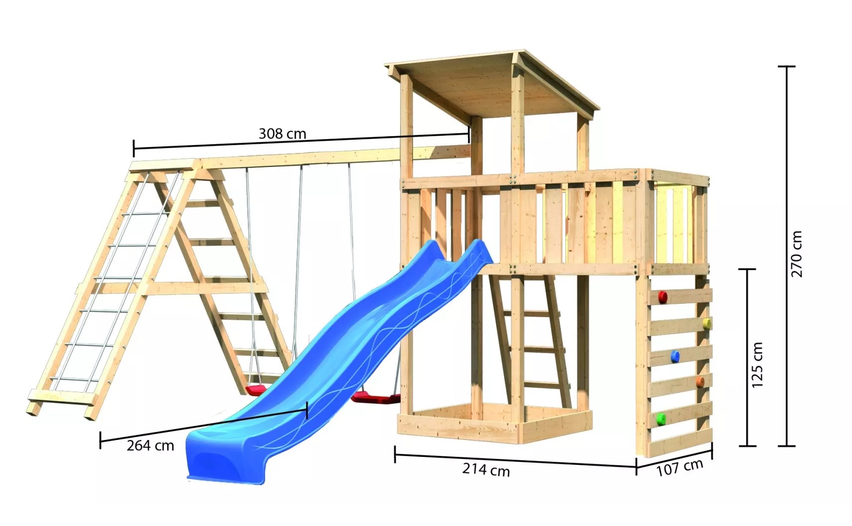 Dětské hřiště KARIBU ANNA poskytuje dětem spoustu možností ke hrám. Nabízí vše k tomu, aby děti mohly prožít veškeré své hrací fantazie. Stejně jako u všech našich dětských hřišť i u modelu KARIBU ANNA používáme výhradně to nejlepší smrkové dřevo. Hřiště má nosné sloupy o tloušťce 68 x 68 mm a je vyrobené z dřevěných profilů o síle 18 mm (spoje v systému pero / drážka). Naše dřevo pochází ze vzdáleného severu Evropy a je chemicky naprosto neošetřené. V důsledku toho je prosté všech známých problematických látek. Díky výšce plošiny 125 cm nabízí hřiště KARIBU ANNA dětem dokonalý výhled na zahradu. Hřiště je standardně vybaveno robustním dřevěným žebříkem se 4 příčkami a pískovištěm pod věží. Dětské hřiště KARIBU ANNA má samozřejmě certifikát TÜV Nord ověřující bezpečnost výrobku (GS) podle DIN EN 71-1, DIN EN 71-3, DIN EN 71-8 a AfPS GS 2014.