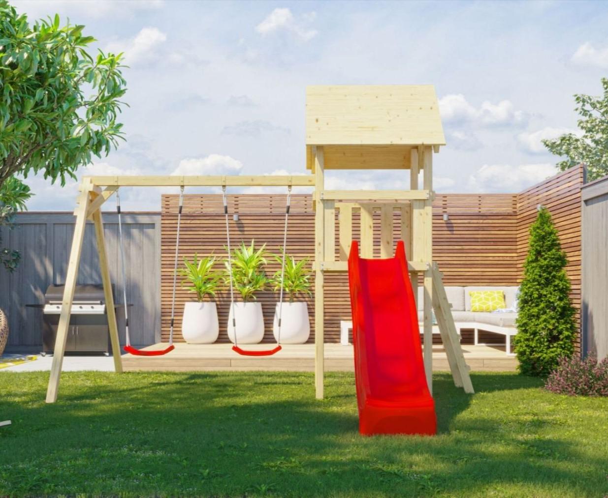 Dětské hřiště, půdorys 347 x 264 cm, věž 107 x 107 x 291 cm, červená skluzavka, houpačka.