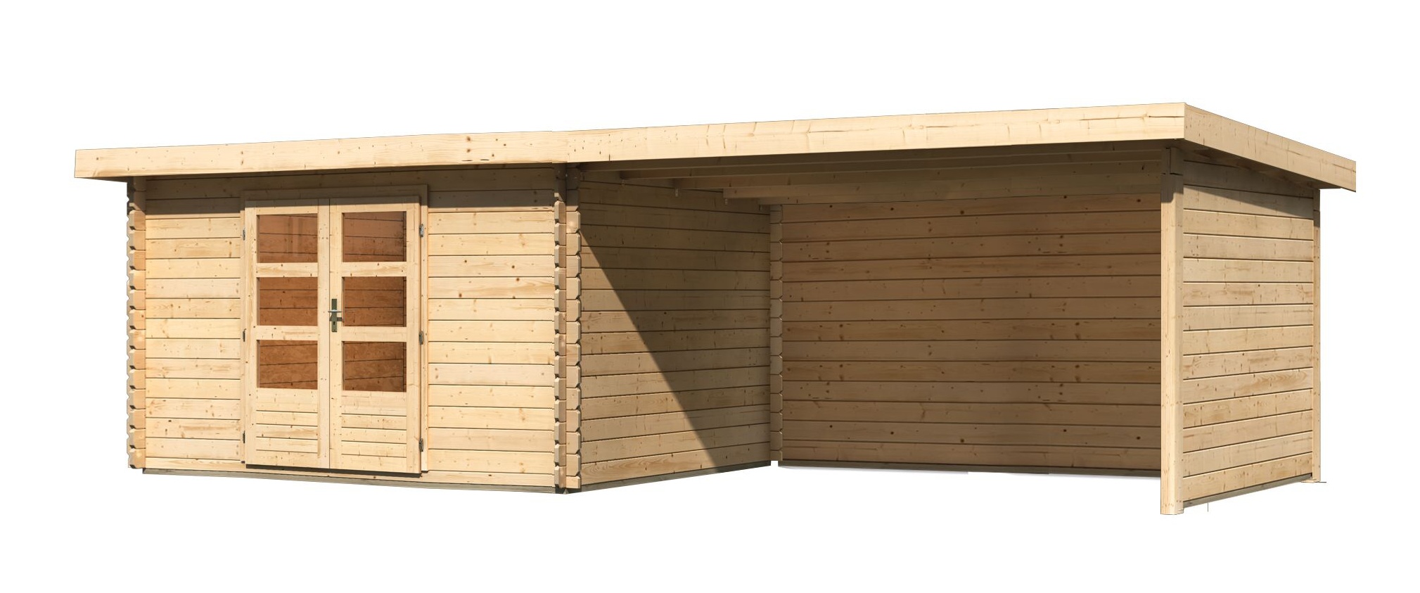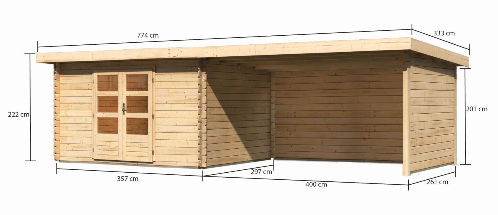 dřevěný domek KARIBU BASTRUP 7 + přístavek 400 cm včetně zadní a boční stěny (9316) natur