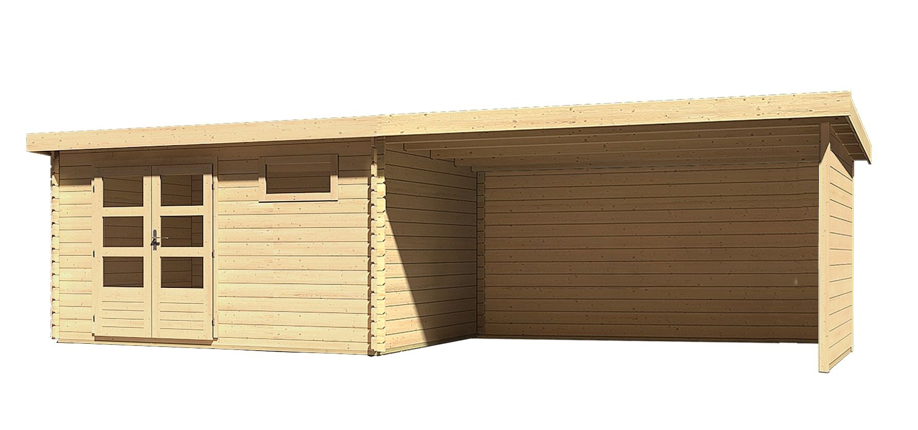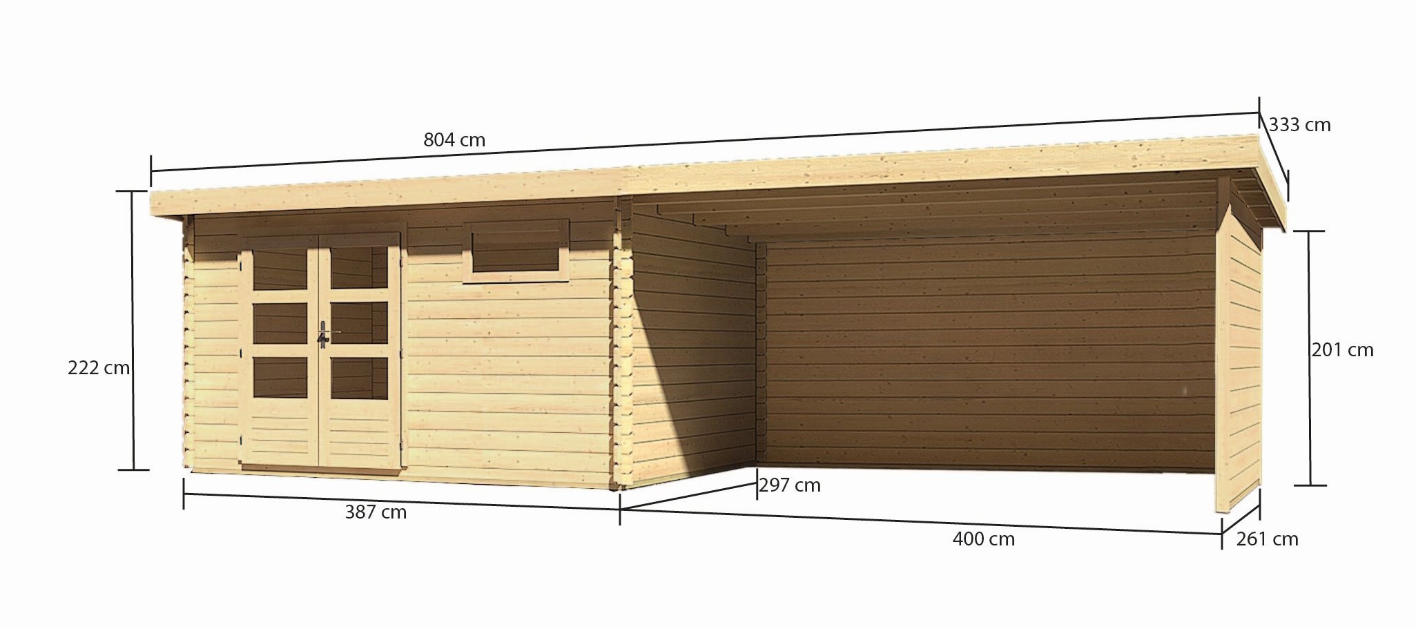 dřevěný domek KARIBU BASTRUP 8 + přístavek 400cm včetně zadní a boční stěny (9320) natur