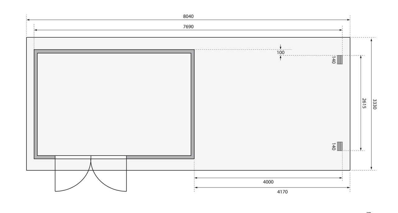 Tato verze domku obsahuje i přístavek včetně zadní a boční stěny délky 400 cm.