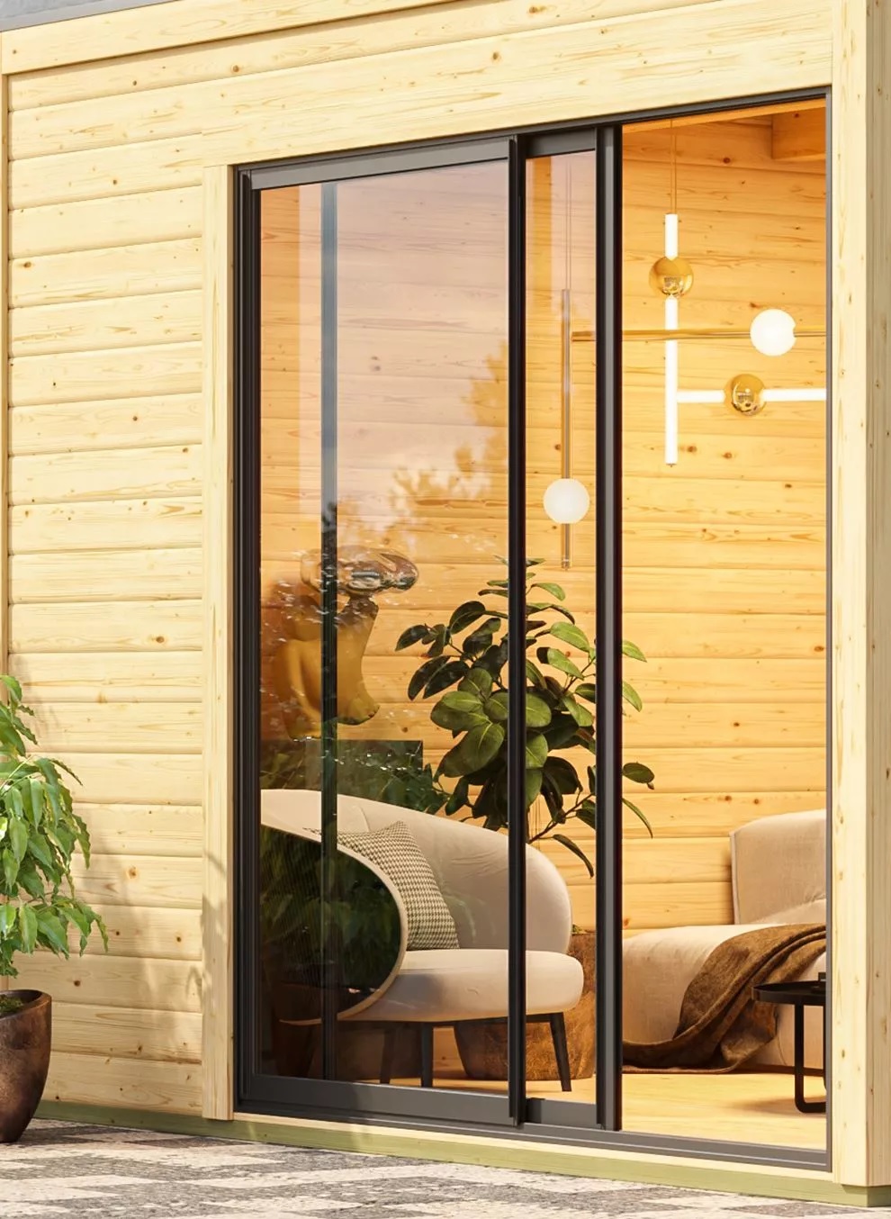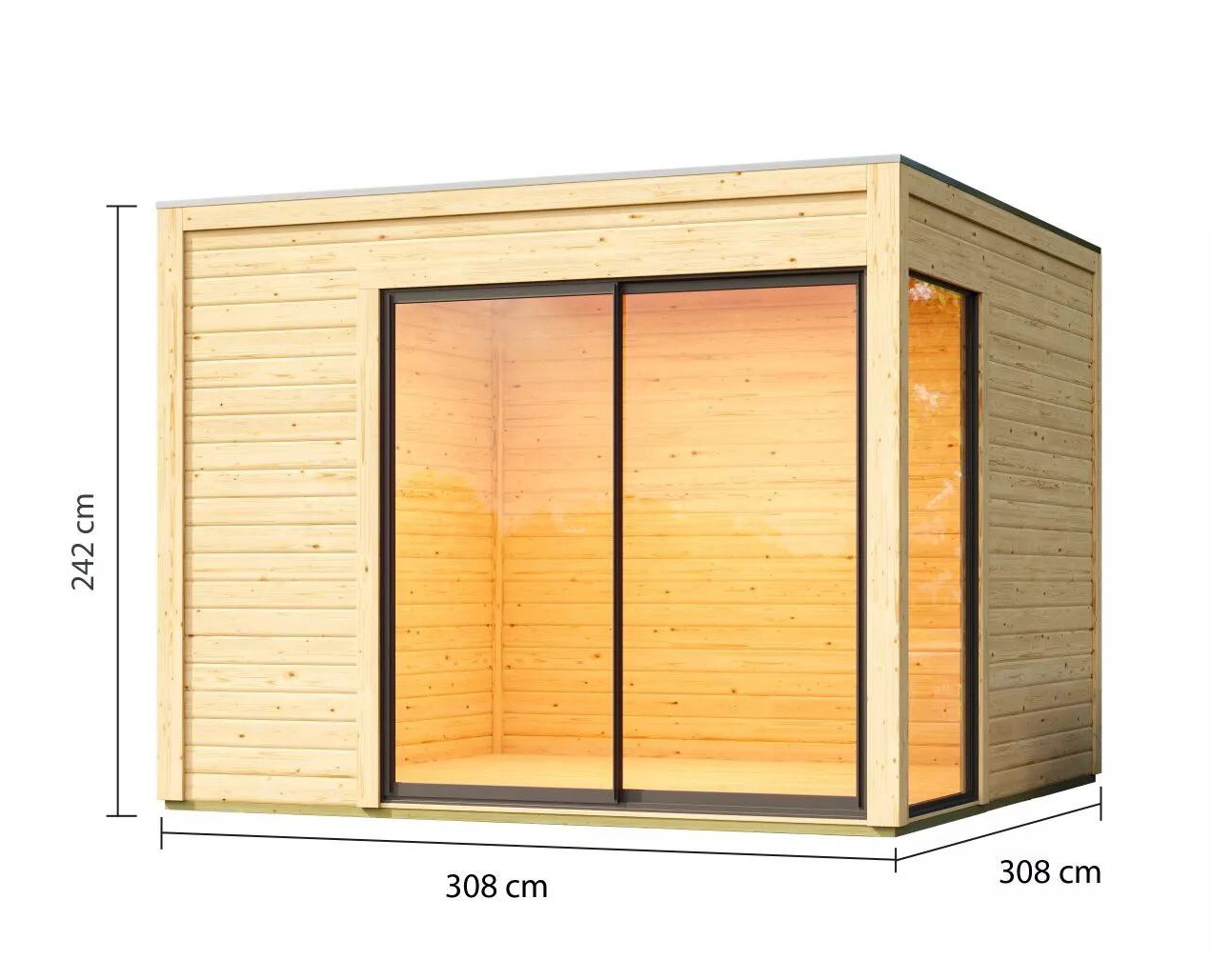 Dřevěný domek s kvalitnější silnou stěnou. Tento model má plochou střechu a hliníkové posuvné dveře s pohyblivým křídlem. Stavebním materiálem domku jsou dřevěné profily síly 38 mm perfektně vyfrézované ze severského smrku. Domek je postaven s dvojitým spojením na pero a drážku, které zvyšuje stabilitu. Dodáváme jako stavebnici v rozloženém stavu, kde stěny tvoří jednotlivé dřevěné profily, které pouze sesadíte k sobě a sešroubujete, střechu tvoří celistvá deska. To garantuje extrémně jednoduchou montáž, kterou zvládne každý český kutil.