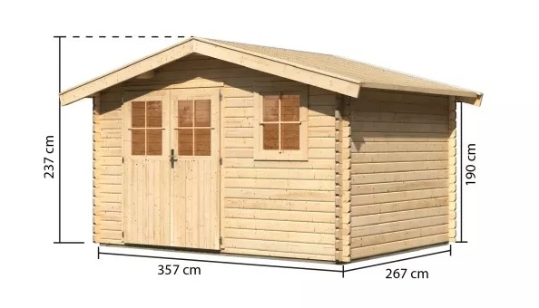Dřevěný domek, síla stěny 38 mm, rozměry š 357 x d 267 cm, vnější plocha domku 9,53 m2.