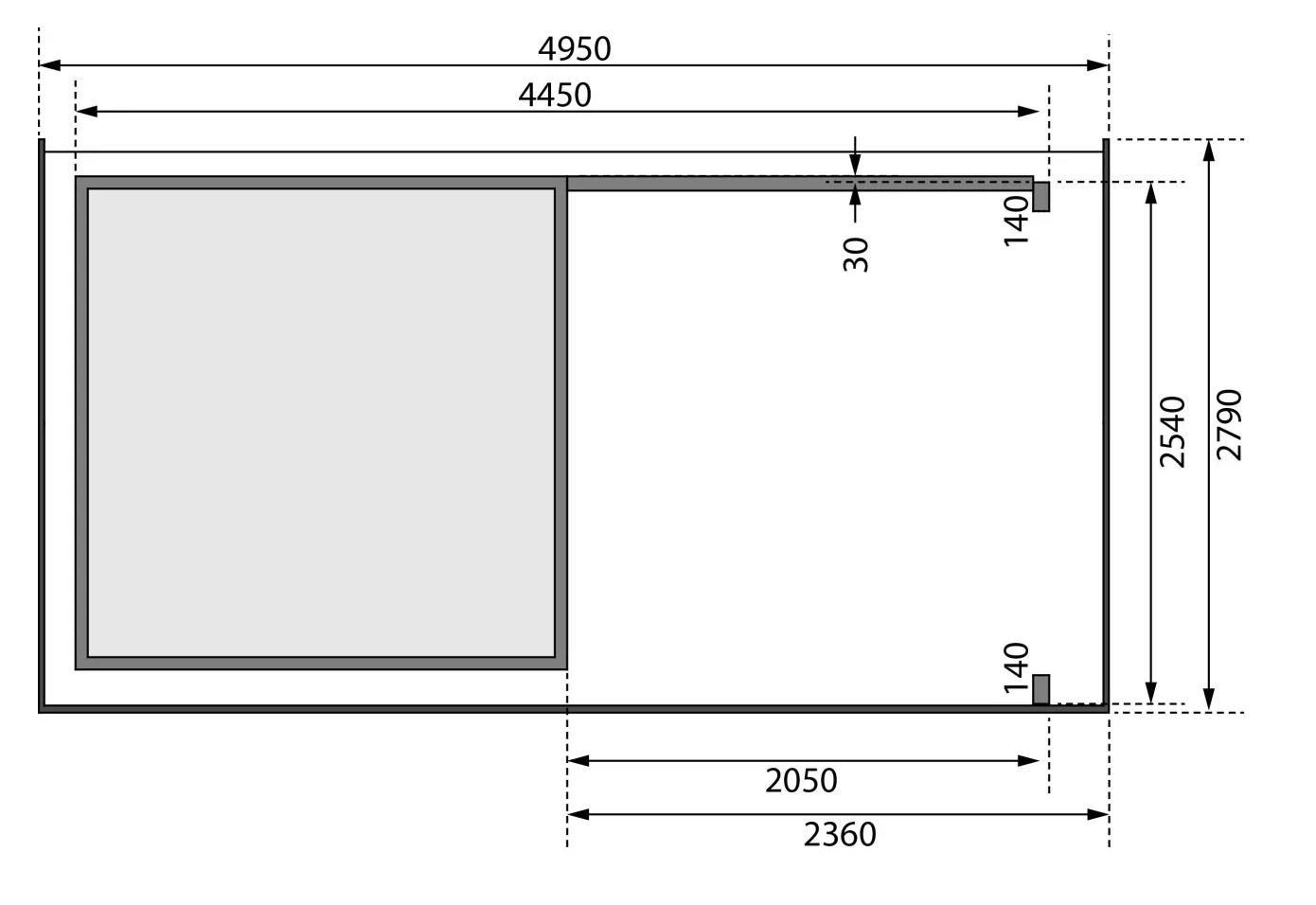Tato verze domku obsahuje přístavek včetně zadní stěny délky 235 cm montovatelný zprava nebo zleva.