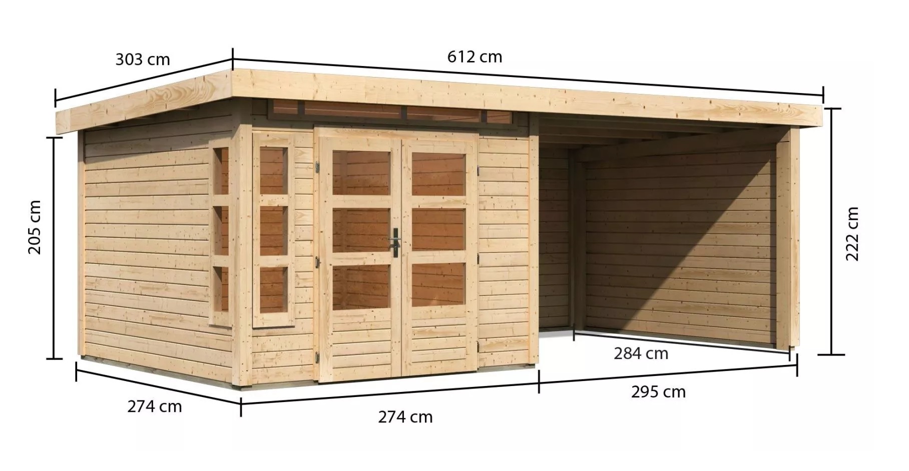dřevěný domek KARIBU KASTORF 6 + přístavek 320 cm včetně zadní a boční stěny (31548) natur