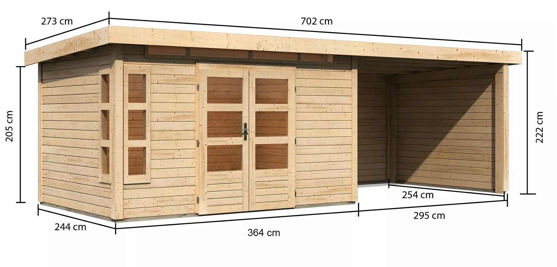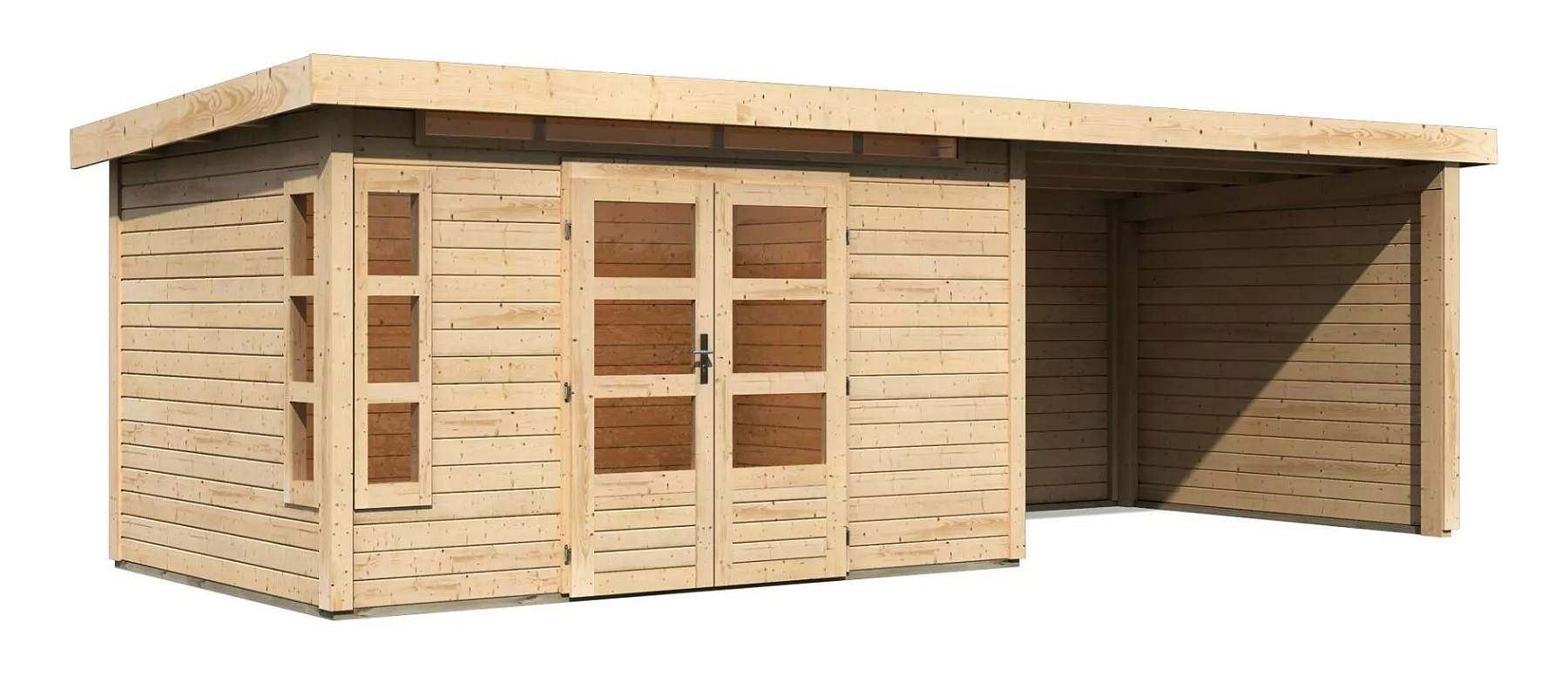 dřevěný domek KARIBU KASTORF 7 + přístavek 320 cm včetně zadní a boční stěny (31560) natur
