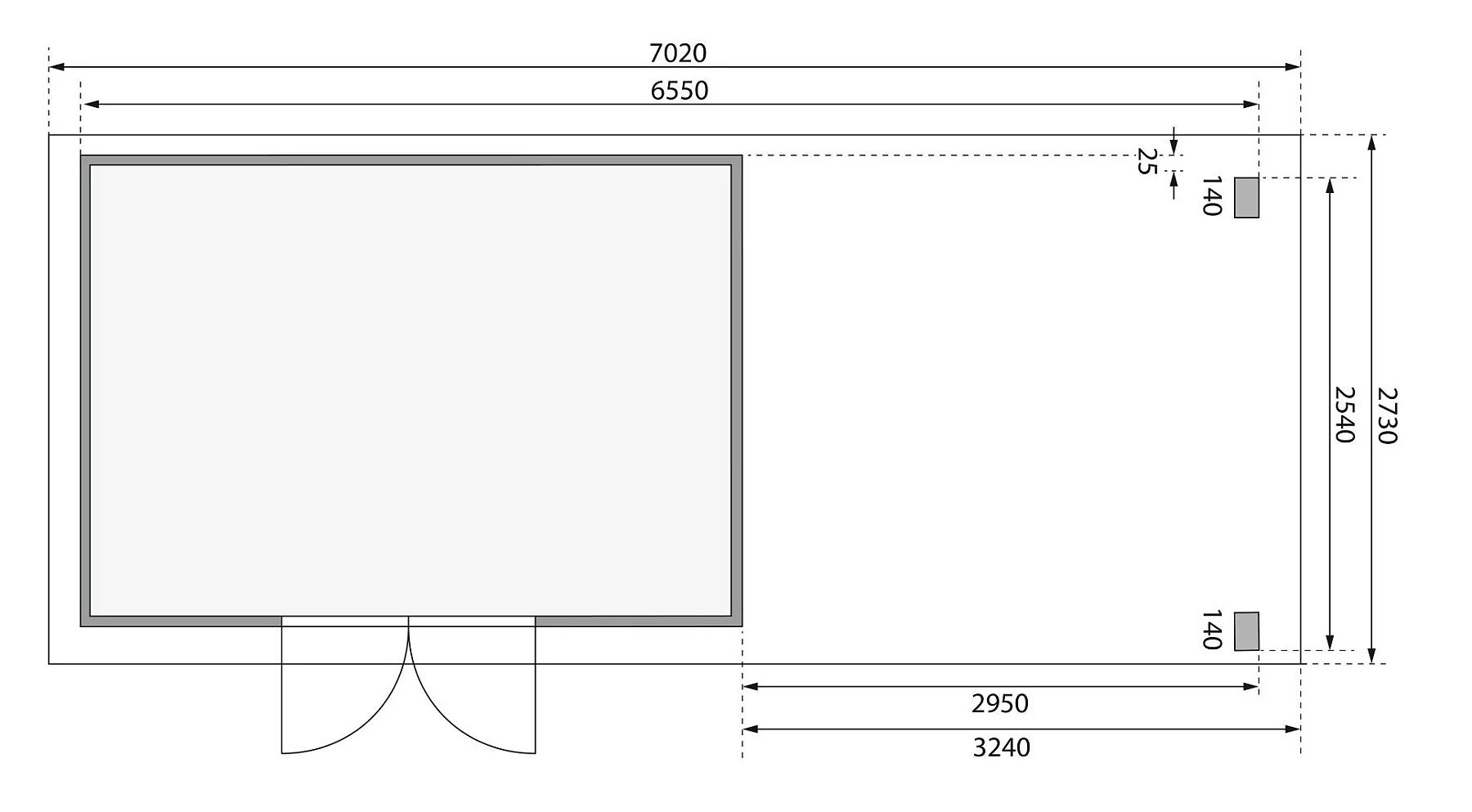 Tato verze domku obsahuje i přístavek včetně zadní stěny délky 320 cm.