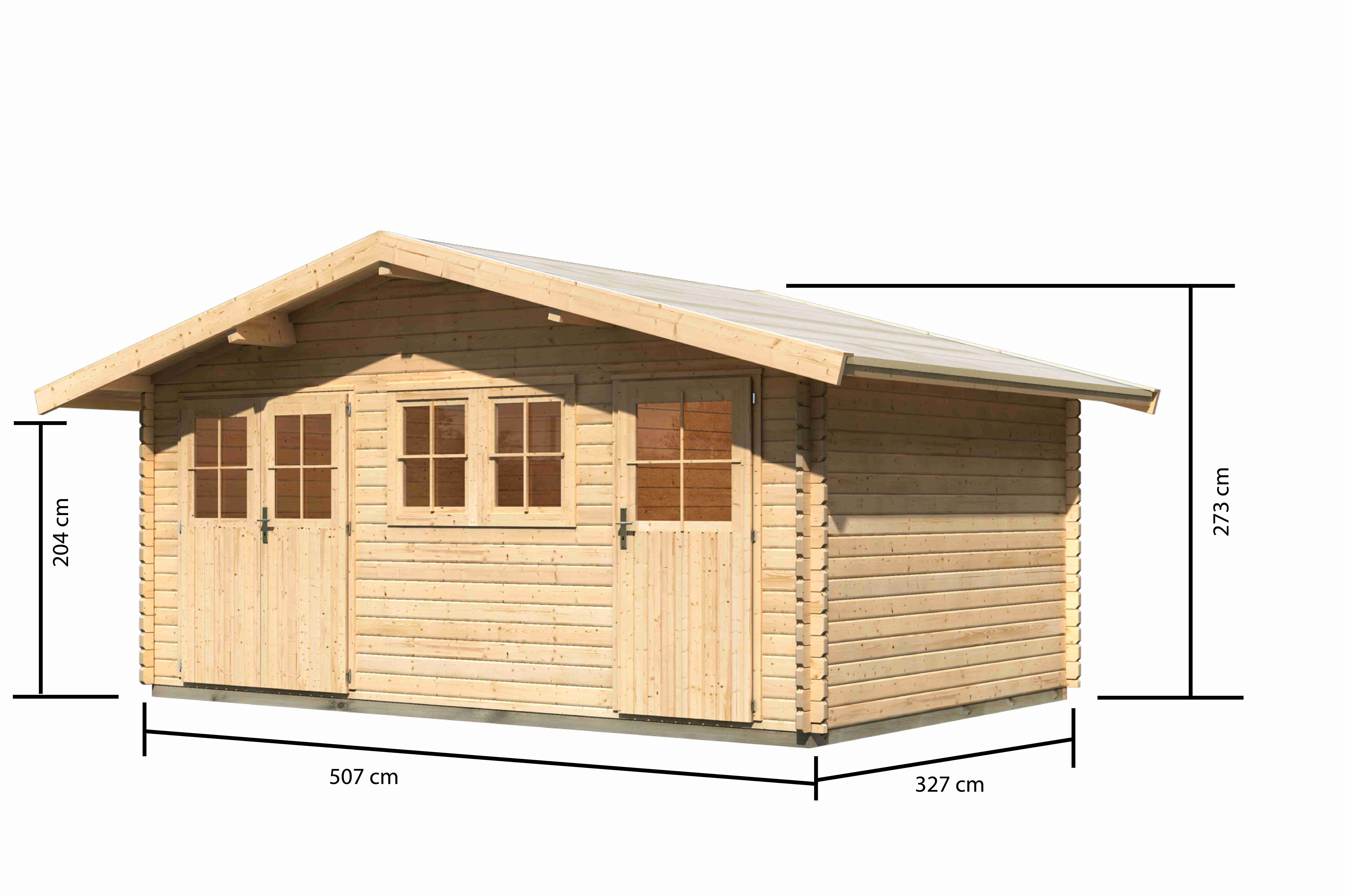 Dřevěný domek, síla stěny 38 mm, rozměry š 507 x d 327 cm, vnější plocha domku 15,25 m2.