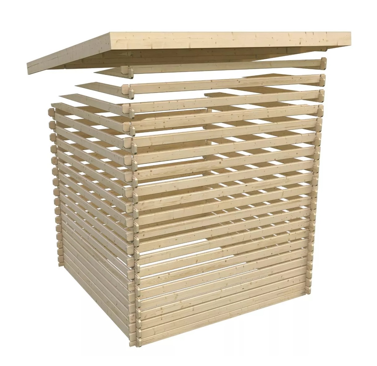 Střecha je zhotovena z dřevotřískových desek. Střešní krytina není obsahem dodávky a je nutné ji ihned po stavbě doplnit podle vlastní volby. Pro domky se šikmou střechou doporučujeme samolepící bitumenovou lepenku, na ploché střechy samolepící střešní hliníkovo-bitumenovou fólii. U střech se sklonem >15o je vhodný i bitumenový šindel. Potřebný počet rolí samolepící ALU-bitumentové krytiny o rozměru 1 x 5 metrů pro tento model domku = 2 role.