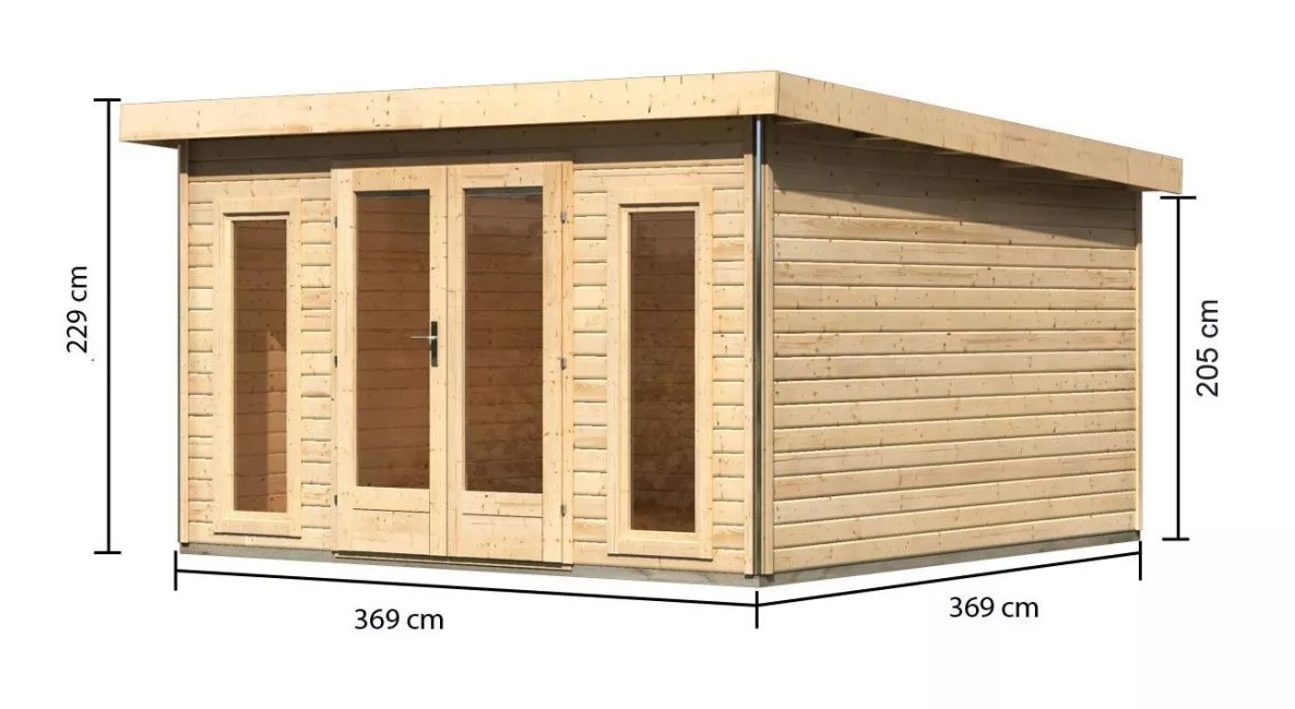 Dřevěný domek, síla stěny 38 mm, rozměry š 369 x d 369 cm, vnější plocha domku 13,61 m2.