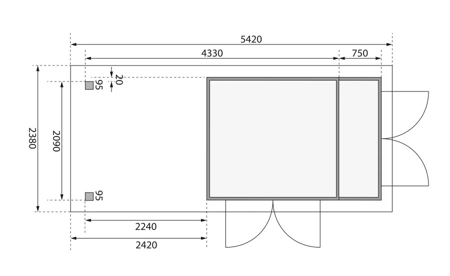 Tato verze domku obsahuje i přístavek délky 240 cm.