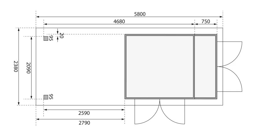 Tato verze domku obsahuje i přístavek délky 280 cm.