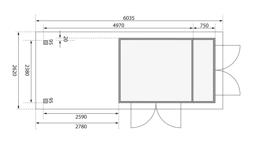 Tato verze domku obsahuje i přístavek délky 280 cm.