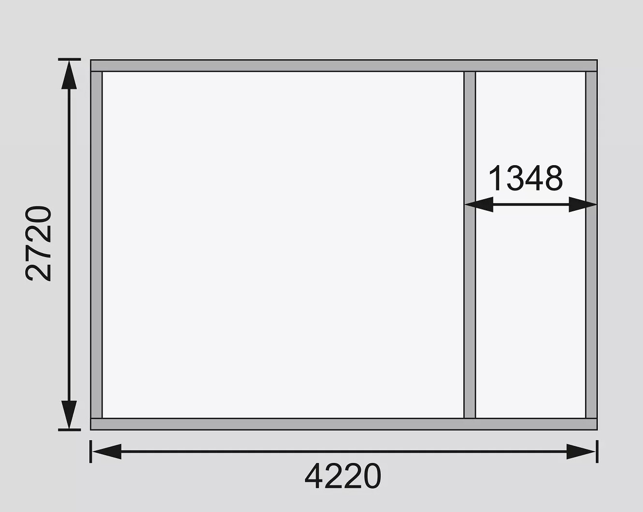 Dřevěný domek, síla stěny 38 mm, rozměry š 426 x d 276 cm, vnější plocha domku 11,75 m2.