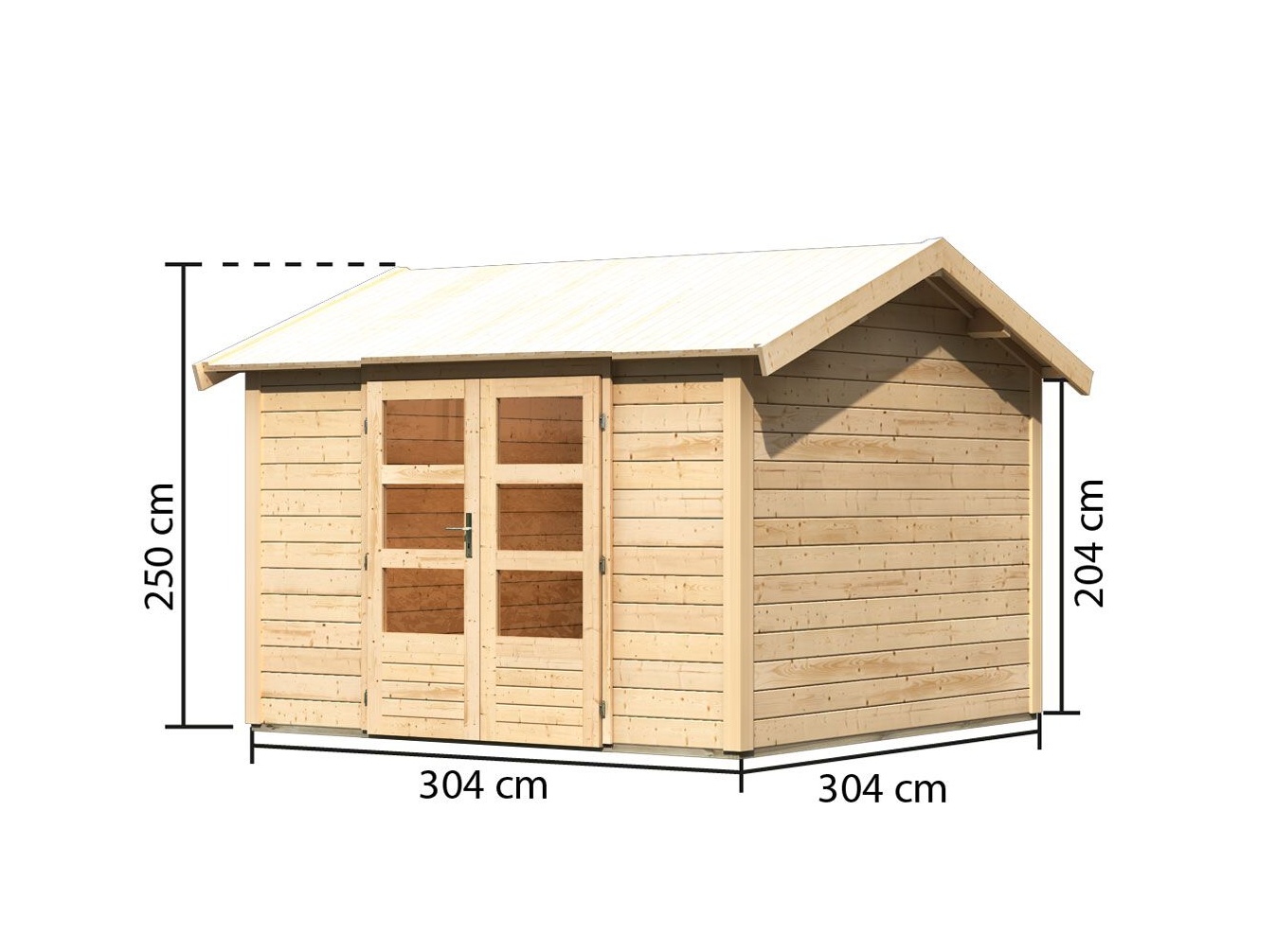 Dřevěný domek, síla stěny 28 mm, rozměry š 304 x d 304 cm, vnější plocha domku 9,24 m2.