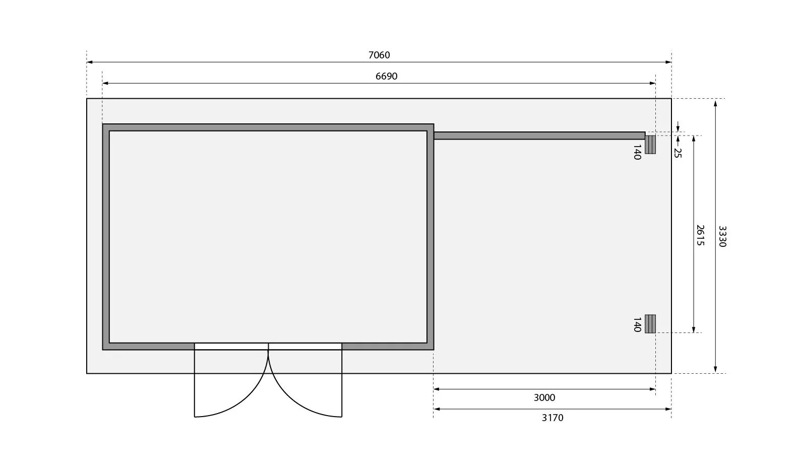 Tato verze domku obsahuje přístavek délky 330 cm včetně zadní stěny montovatelný zprava nebo zleva.