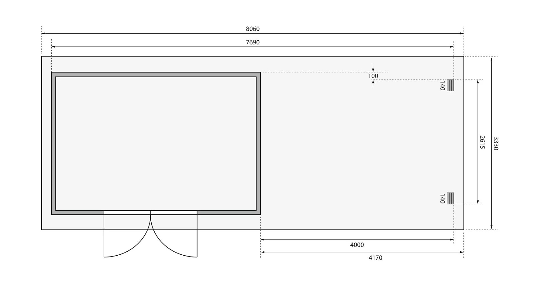 - dvoukřídlé dveře na pantech o celkové světlosti š 140 x v 170 cm