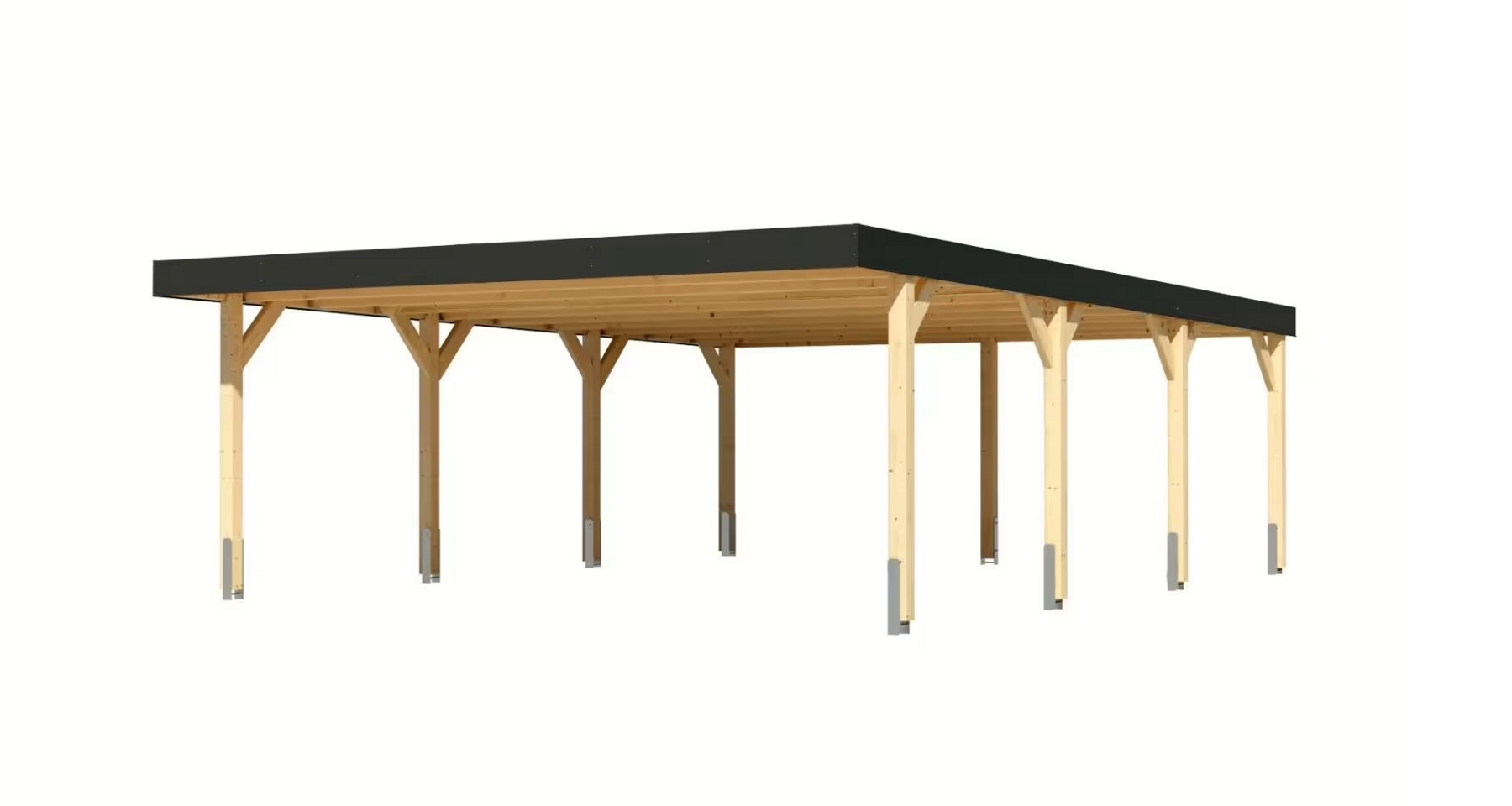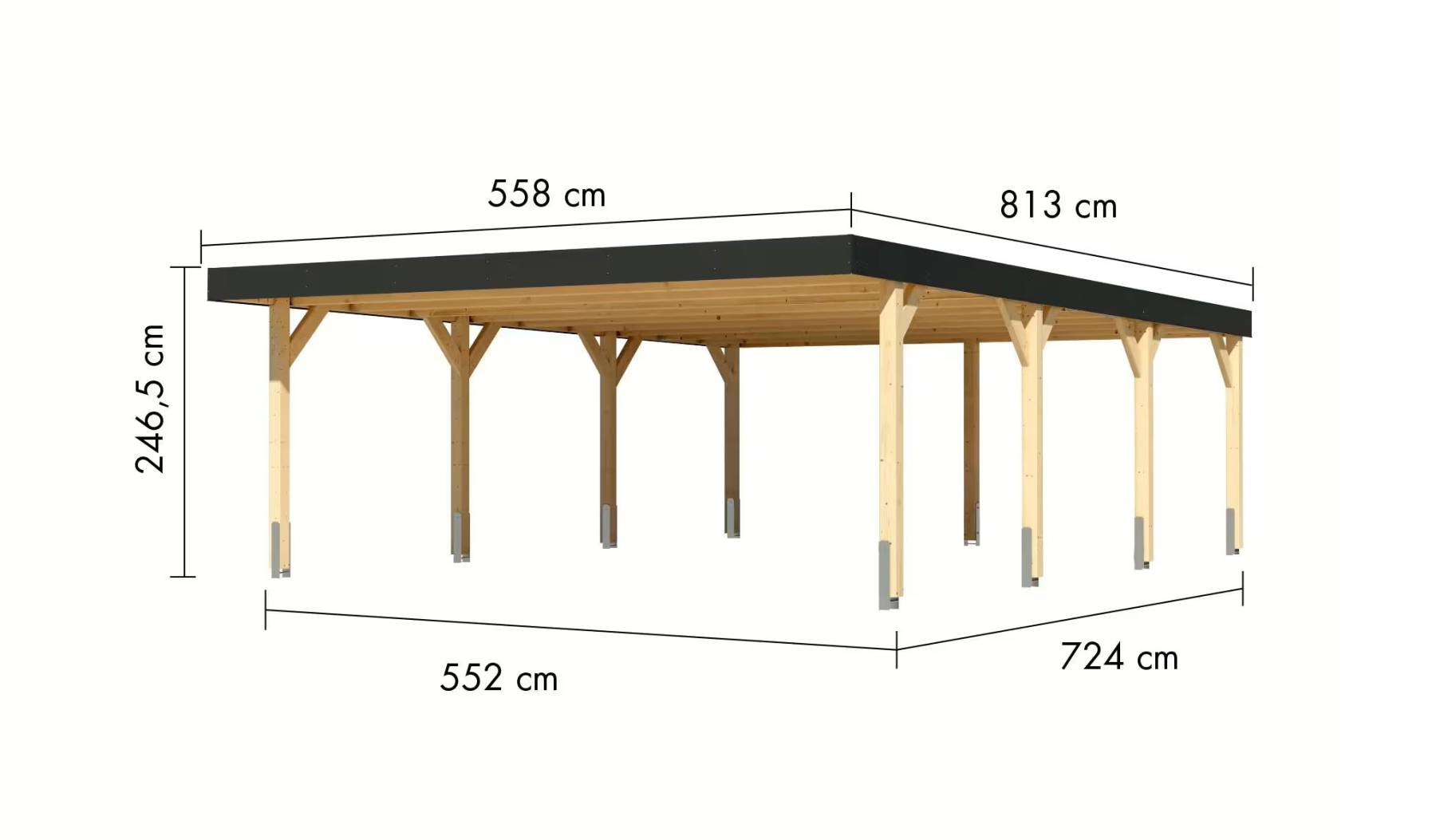 Přístřešek má obdélníkový tvar a svými rozměry vyhovuje většině modelů vozidel běžných na českém trhu. Celková zastřešená plocha je 5,58 x 8,13 m. Díky průjezdné výšce 210 cm je vhodný i pro vyšší automobily a SUV. Střechu podpírá osm robustních sloupků 12 x 12 cm. Celá konstrukce je vyrobena z vysoce kvalitního lepeného smrkového dřeva, které vyniká mimořádnou odolností vůči nepříznivým povětrnostním vlivům. Střešní konstrukce je dimenzována na sněhovou zátěž 140 kg/m2. Vzhledem k velké ploše střechy a zatížení větrem je nutné přístřešek bezpečně ukotvit k zemi pomocí vhodných zemních kotev (nejsou součástí dodávky, lze je dokoupit jako příslušenství).