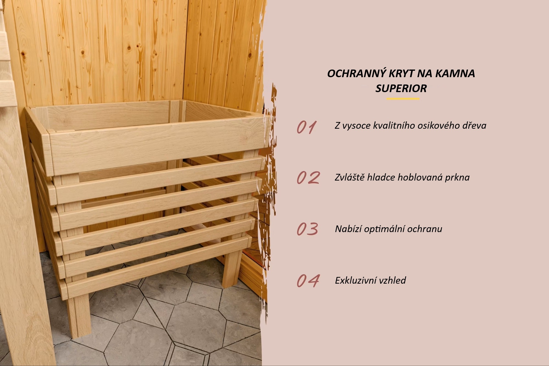 Obsahem standardního balení je 2x lavice z osikového dřeva (1x šířka 57 cm + 1x 27 cm, max. 250 kg) 1x podhlavník, 1x podlahový rošt a dřevěný ochranný rám na kamna. Doporučujeme další saunové příslušenství z naší nabídky.