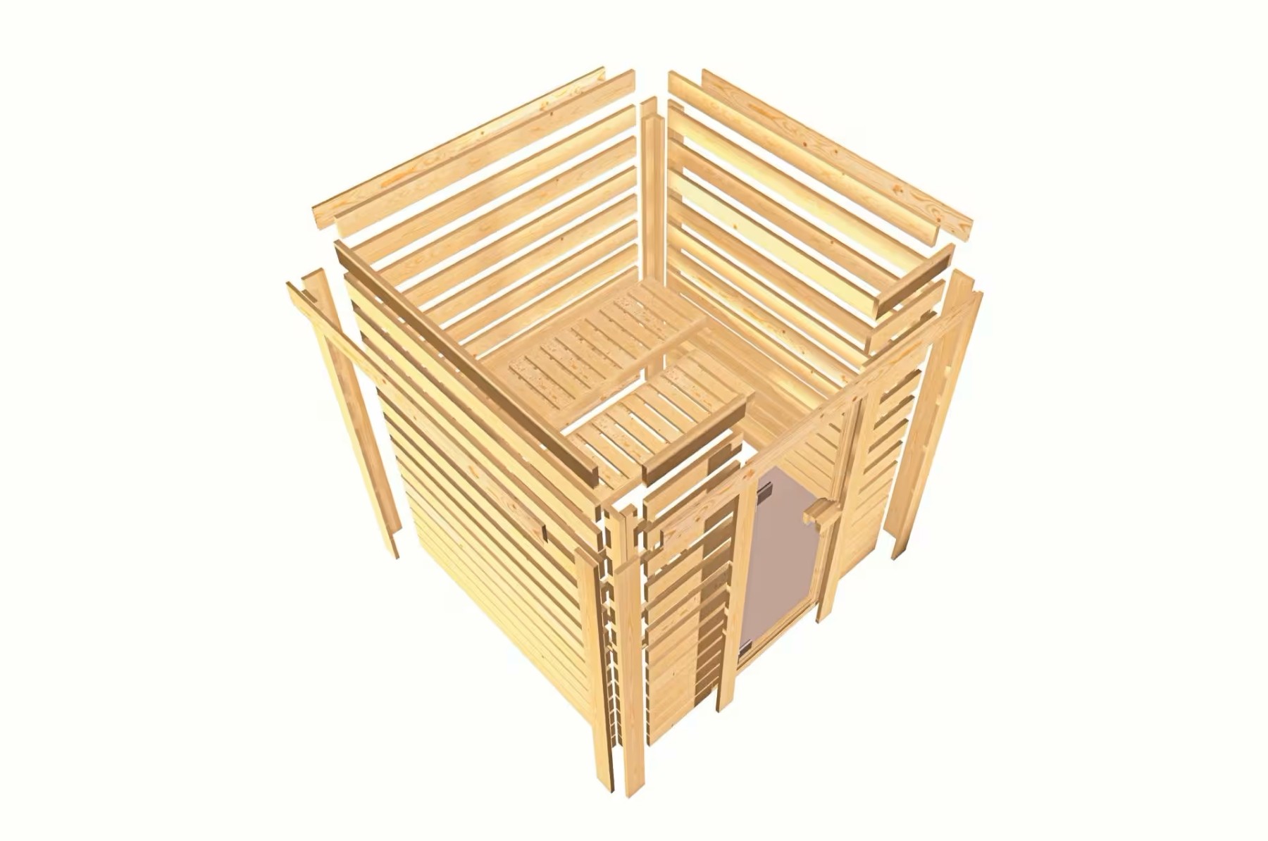 Finská sauna určená pro dvě sedící osoby. Má rozměr š 158 x h 158 x v 207 cm s rohovými dveřmi. Tento model finské sauny je určený do temperovaných interiérů domu nebo bytu. Její výrobce, firma KARIBU HOLZTECHNIK z německých Brém, dokázala svými výrobky úspěšně navázat na staletou tradici skandinávského saunování a současně do ní zapracovat dnešní moderní technologie. Sauna je celá vyrobena ze dřeva severského smrku v přírodním provedení. Dřevo pochází ze vzdáleného severu Evropy a je chemicky naprosto neošetřené (není ani namořeno ani nalakováno). V důsledku toho je prosté všech známých problematických látek, které by se v průběhu saunování mohly ze dřeva uvolňovat. Tato interiérová sauna je vyrobena z masivního dřeva síly 38 mm. Stěny sauny jsou složeny ze speciálně hlazených prken s dvojitým perem a drážkou, což garantuje neobyčejnou pevnost spoje.