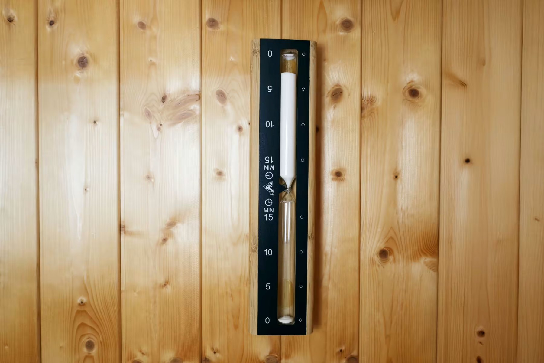 A prémium szauna kiegészítő készlet modern dizájnban ötvözi a hőmérőt, a higrométert, a homokórát, a vödröt, a merőkanalat és az aromatartályt.