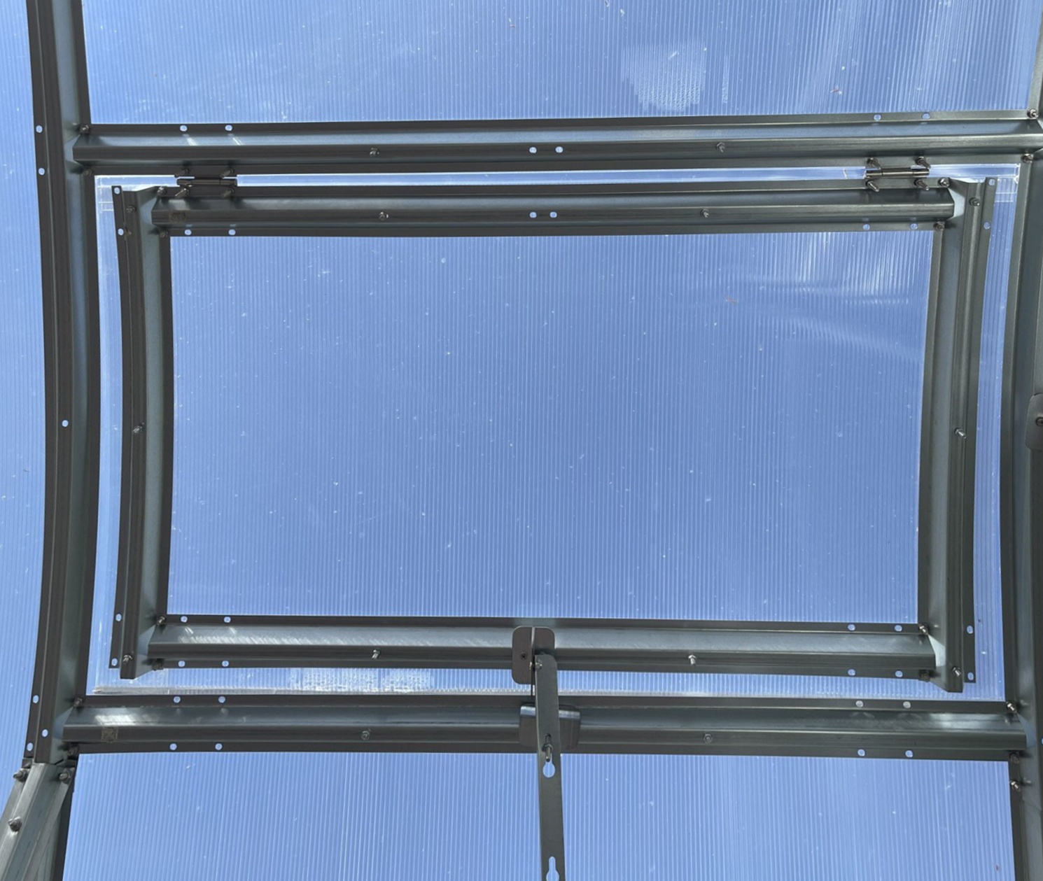 Obloukové střešní okno pro skleníky LANITPLAST KYKLO2 s polykarbonátem 4 / 6 mm, rozměr 0,60 x 0,95 m, možnost instalace aut. otvírače.