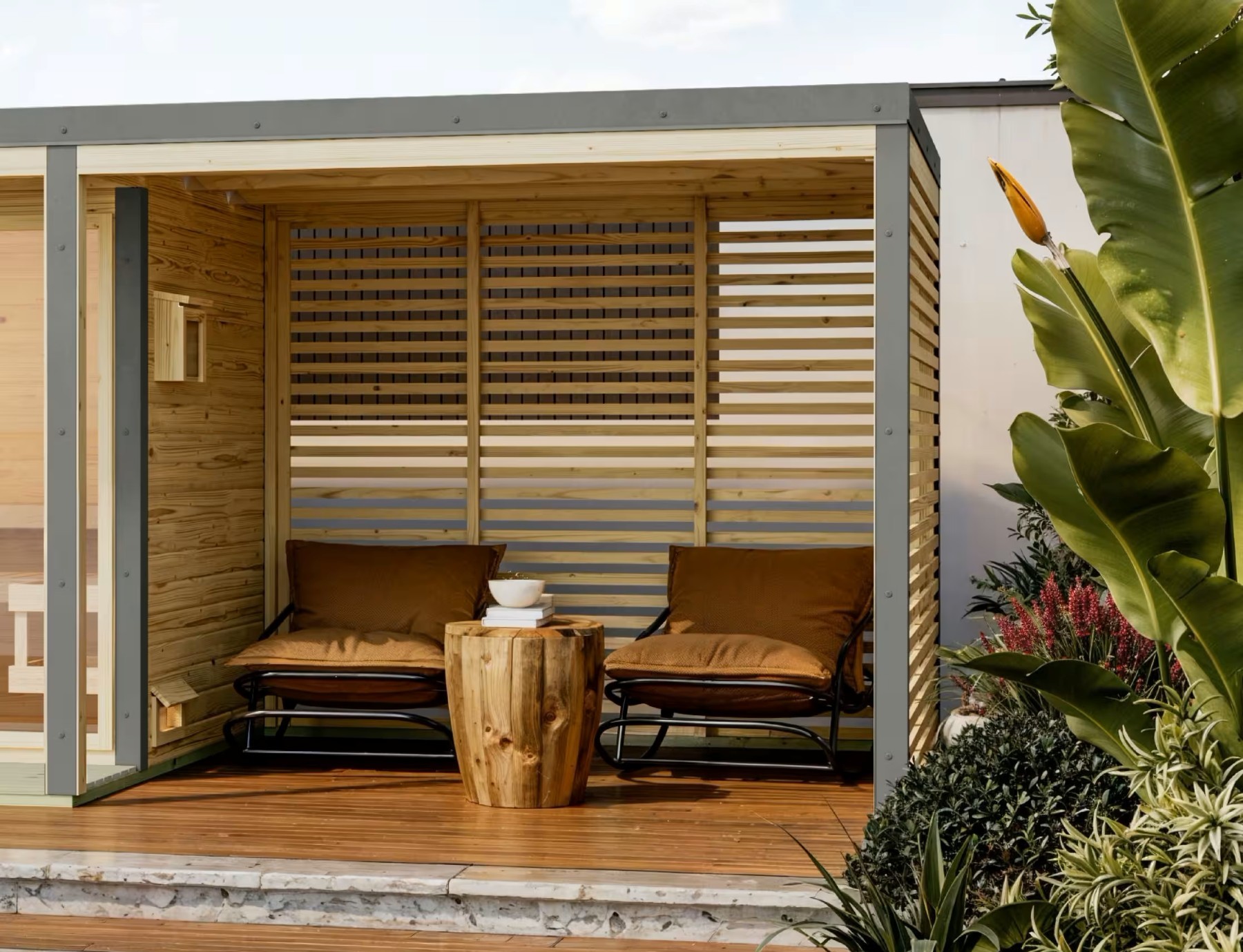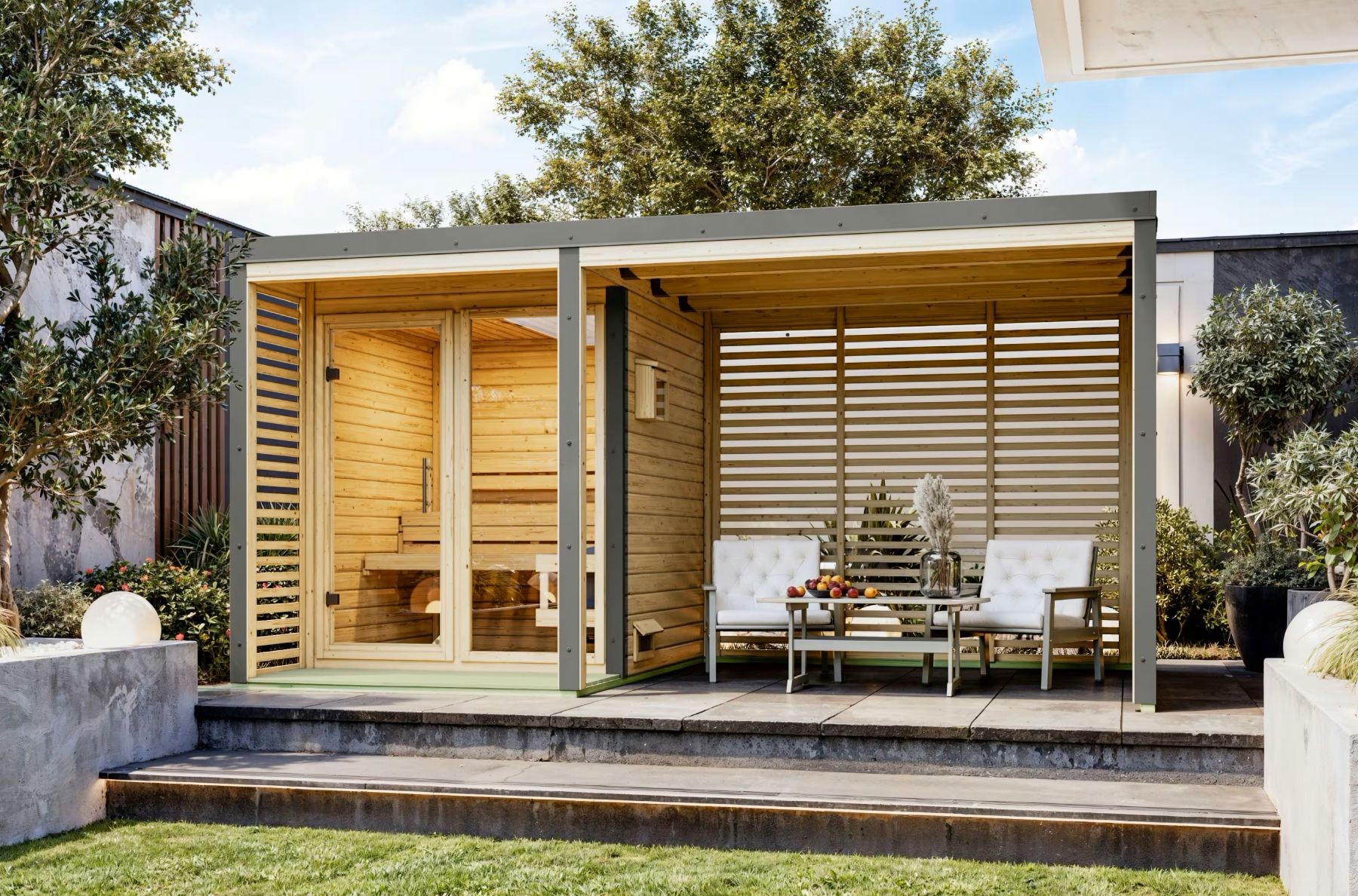 Přístavek k venkovní finské sauně ARES včetně lamelových stěn o vnějších rozměrech: š 2,69 x h 2,76 x v 2,32 m