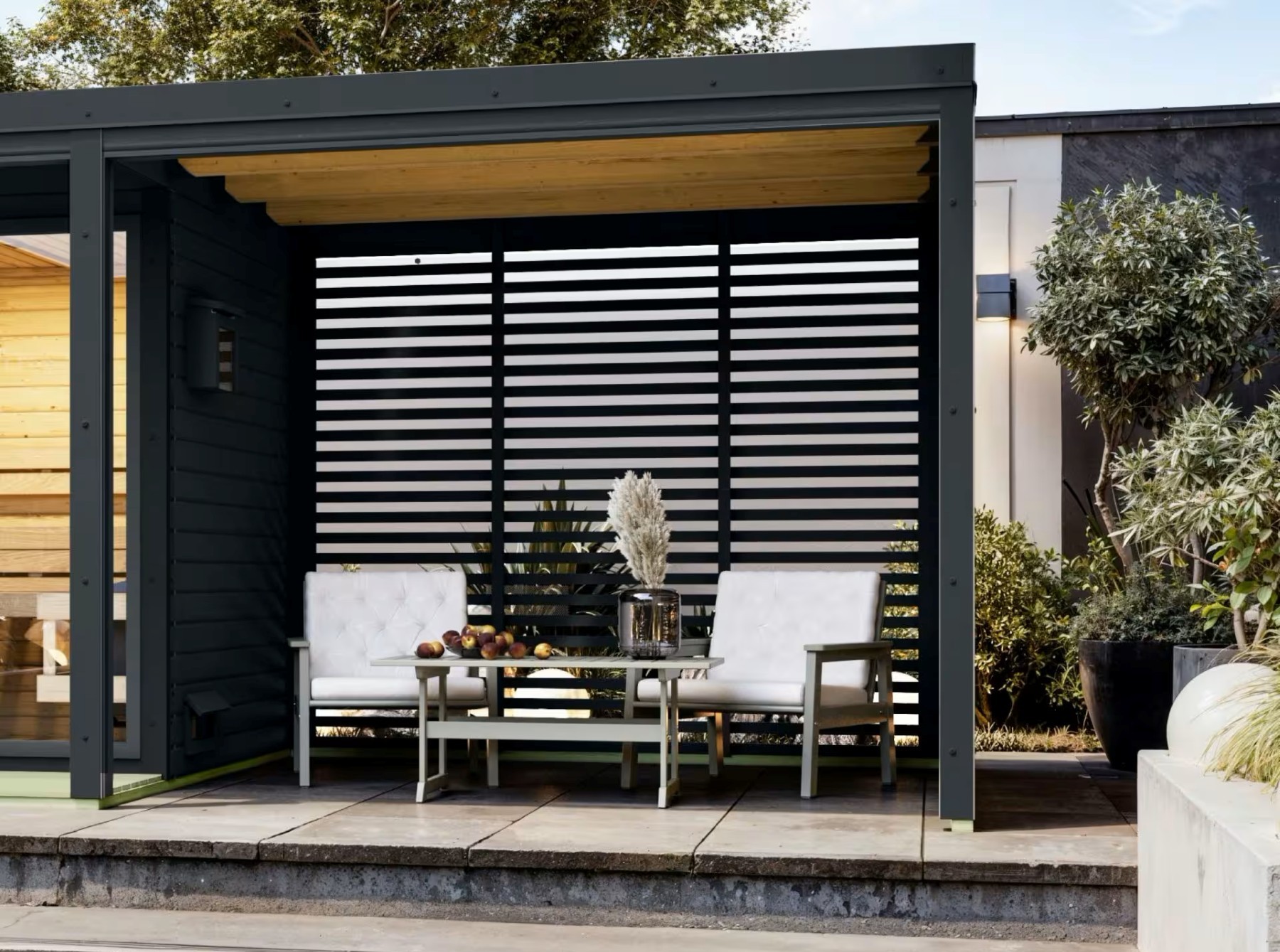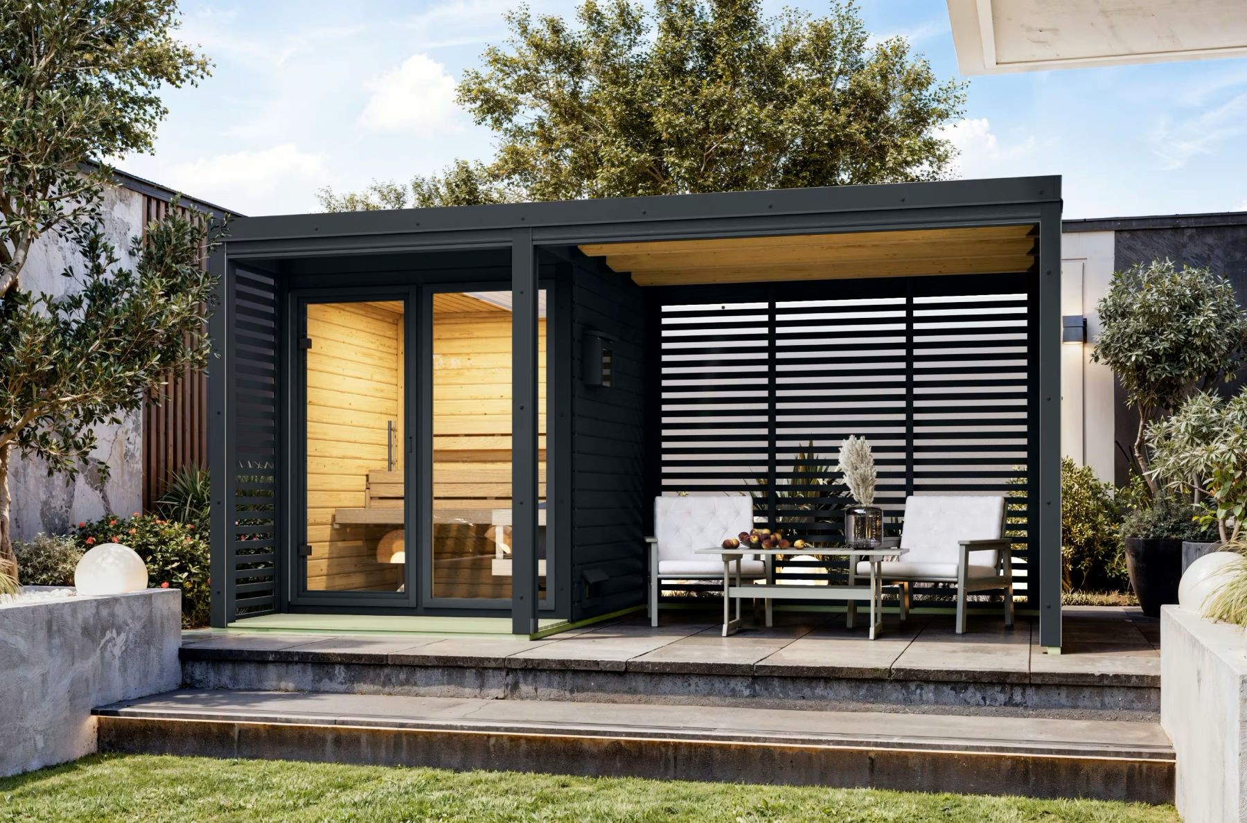Přístavek k venkovní finské sauně ARES včetně lamelových stěn o vnějších rozměrech: š 2,69 x h 2,76 x v 2,32 m