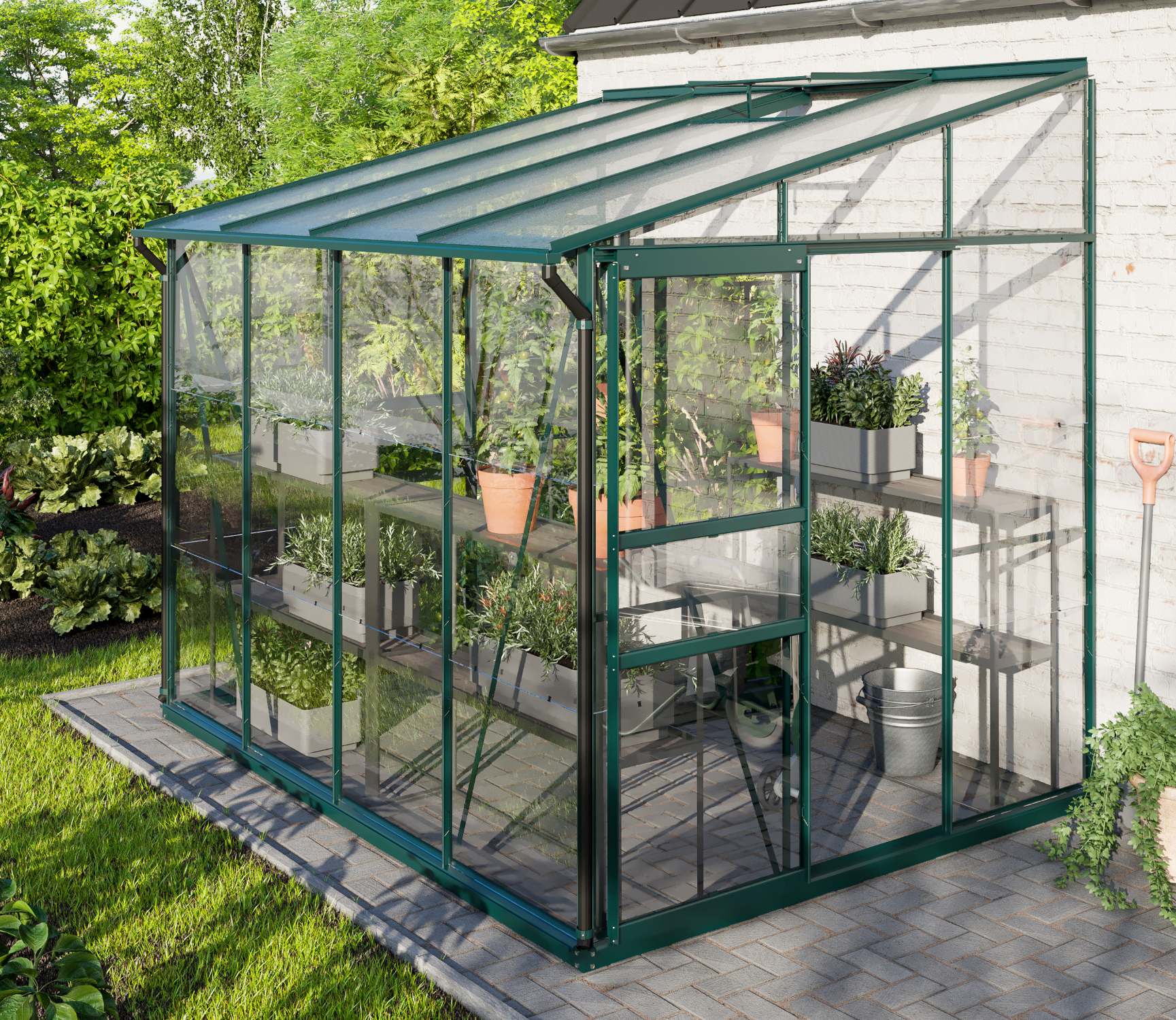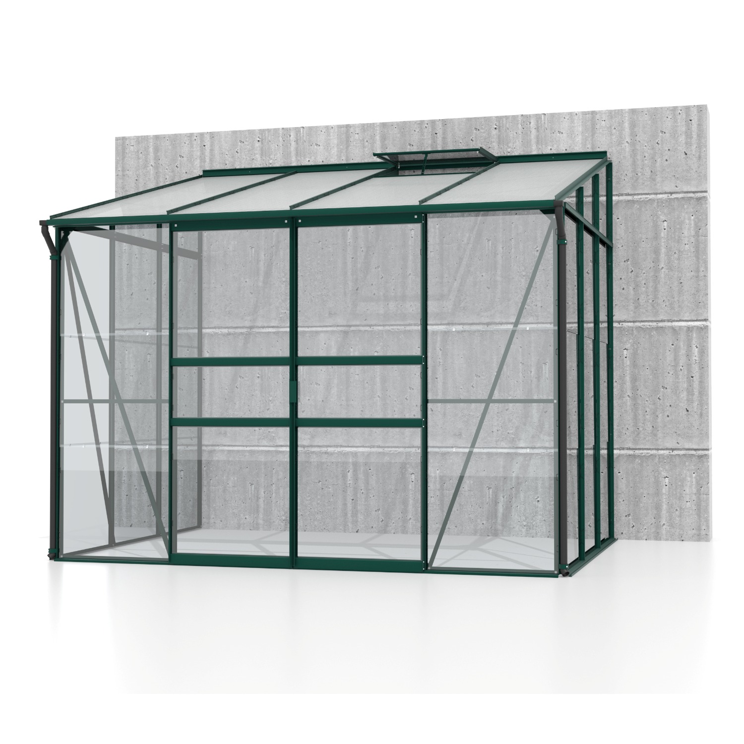 Hliníkový skleník k stene, š 2,62 x d 2,01 m, zelená farba, 1x str. okno, kalené číre sklo 3 mm + PC 6 mm, plocha 5,27 m2.
