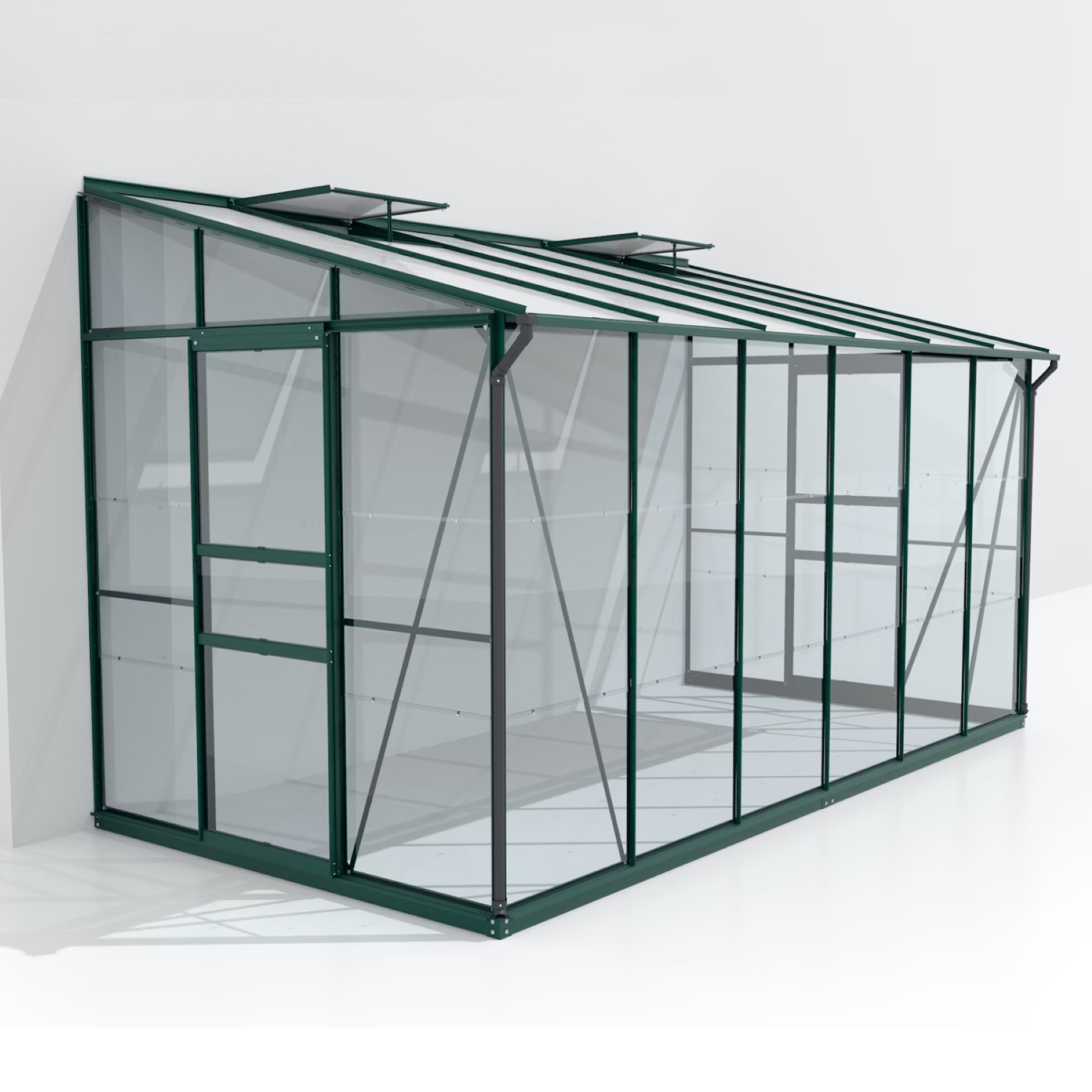 Hliníkový skleník k stene, š 3,87 x d 2,01 m, zelená farba, 2x str. okno, kalené číre sklo 3 mm + PC 6 mm, plocha 7,79 m2.