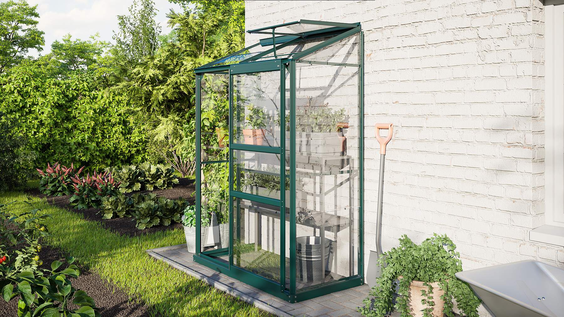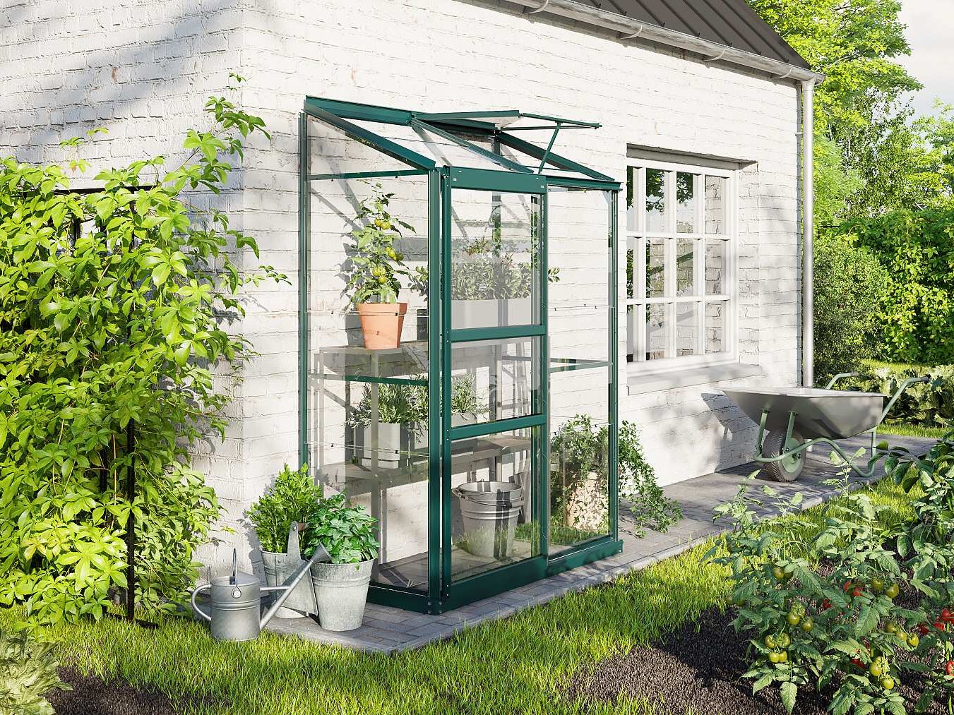 Skleník je určený na montáž k stene – zadná stena nie je súčasťou konštrukcie.