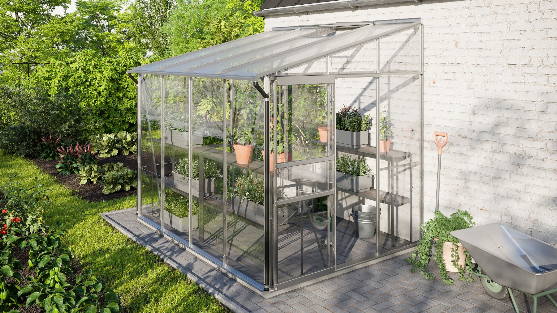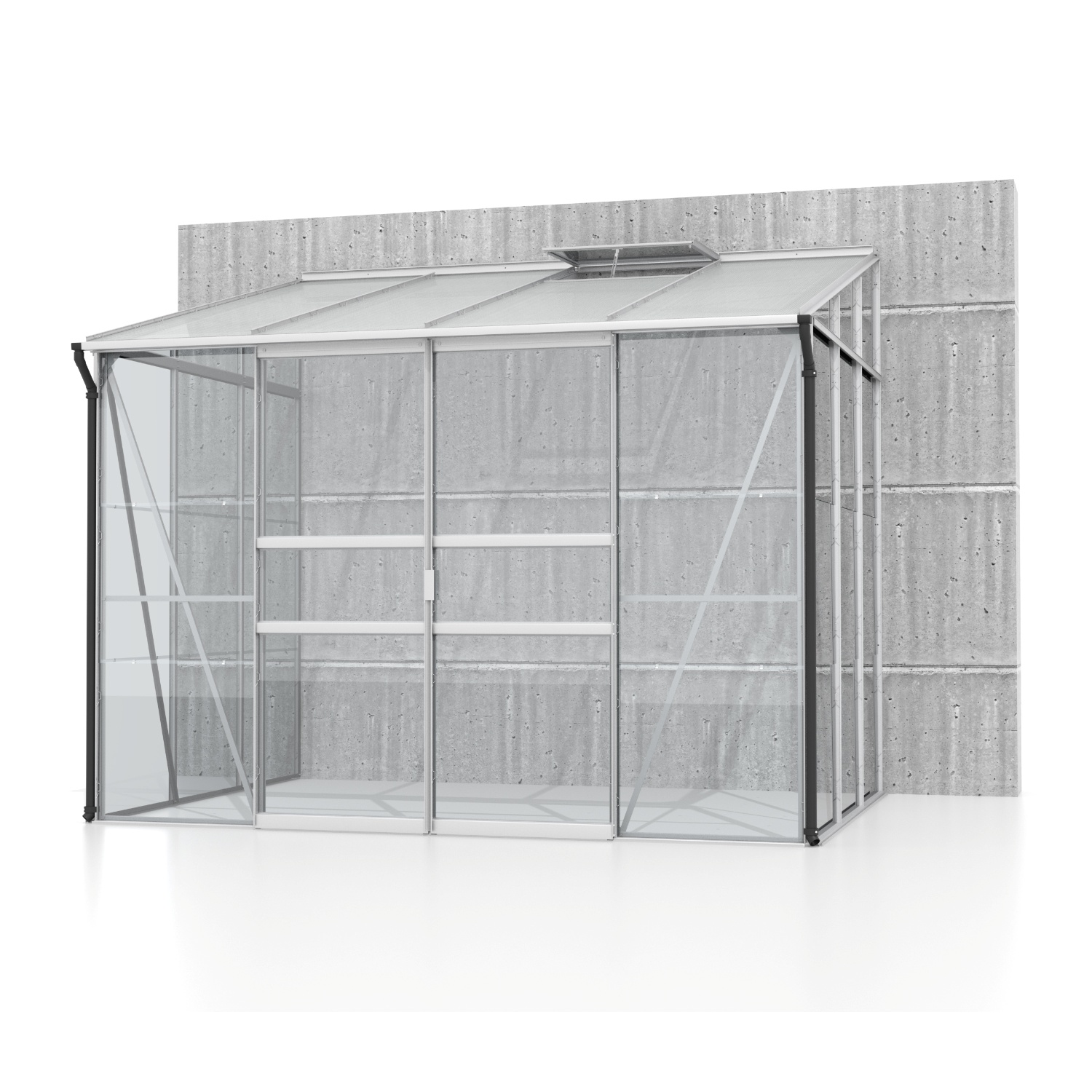 Skleník je určen k montáži ke zdi – zadní stěna není součástí konstrukce.