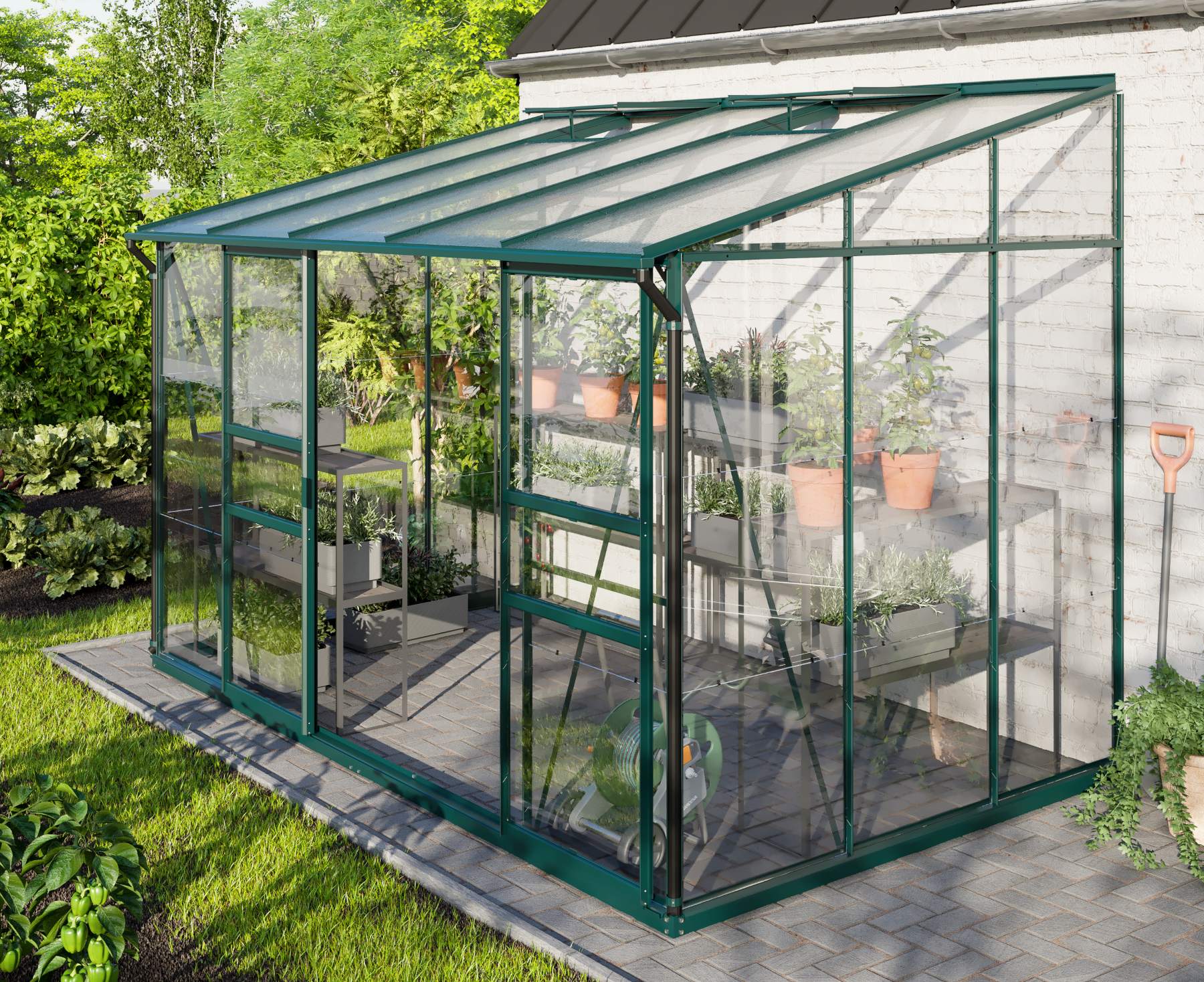 Hliníkový skleník ke stěně, š 3,24 x d 2,01 m, zelená barva, 2x stř. okno, kalené čiré sklo 3 mm + PC 6 mm, plocha 6,51 m2.