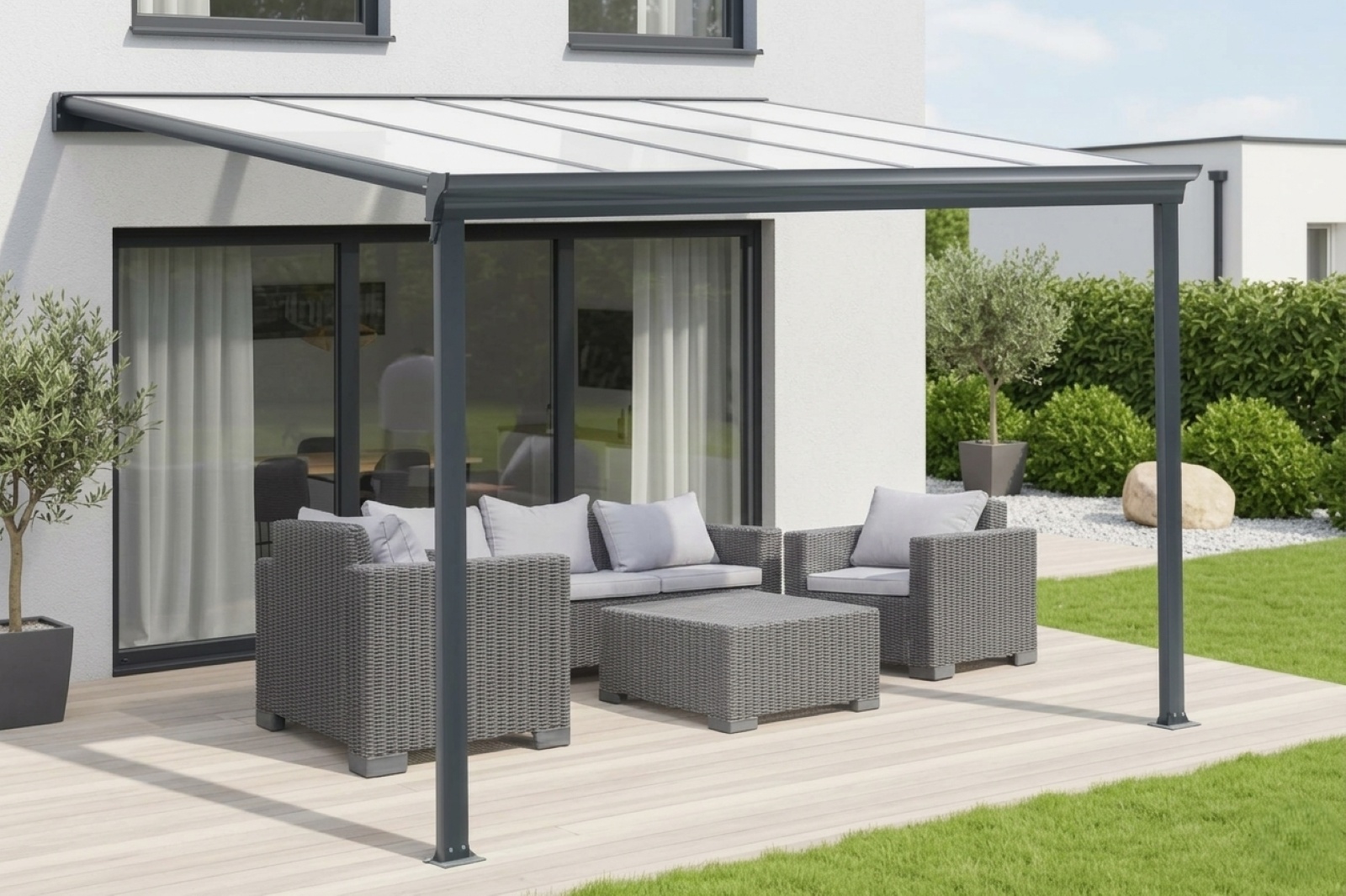 Falra erősített alumínium pergola, melyben kellemes pihenőhelyet talál közvetlenül a háza mellett. A kerti pergola konstrukciója tartós alumíniumötvözetből készült, porfestékkel (komaxit) szórva, ezért tartósan ellenáll a természetes éghajlati hatásoknak. A tető polikarbonát duplafalú, 6 mm vastag cellás üvegezésből készül, melyet 3 árnyalatban szállítunk - átlátszó vagy tejfehér áttetsző (ún. OPAL) vagy füstbarna (BRONZ). A maximális minőség érdekében a pergola tetejére kizárólag a MARLON ST LONGLIFE (gyártó: BRETT MARTIN Nagy-Britannia) prémium cellás polikarbonát lemezeket használunk, amelyek a csehországi államilag akkreditált vizsgálólaboratóriumokban átmentek építőanyagként (tűzvizsgálatok, mechanikai vizsgálatok, egészségbiztonság). A polikarbonát tetők jégeső elleni törhetetlenségére 10 év szerződéses kiterjesztett garanciát vállalunk.