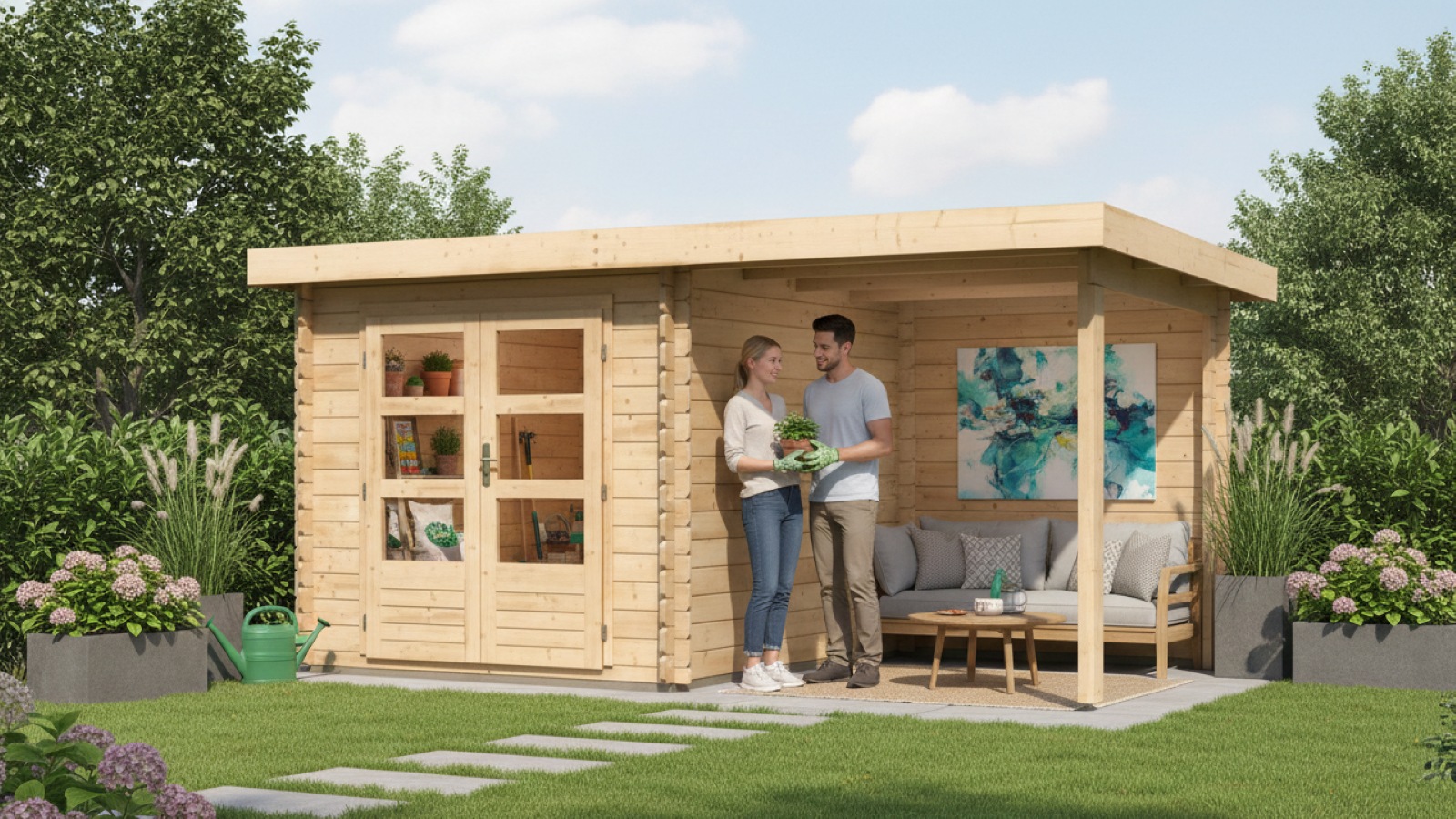 Egy faház alapmodellje kertjébe. Ez a modell lapos tetővel és dupla csuklós ajtókkal rendelkezik, mindkét szárnyban ablakkal. A ház építőanyaga 28 mm vastag, északi lucfenyőből tökéletesen mart faprofil. Bontott állapotban készletben szállítjuk. A sorozat nagy előnye a szabadalmaztatott 6-Plus sarokcsukló. Ezek együttesen nemcsak tartós és stabil konstrukciót, hanem robusztus összképet is biztosítanak. Ez garantálja a rendkívül egyszerű összeszerelést, amelyet bármely barkácsoló meg tud kezelni.