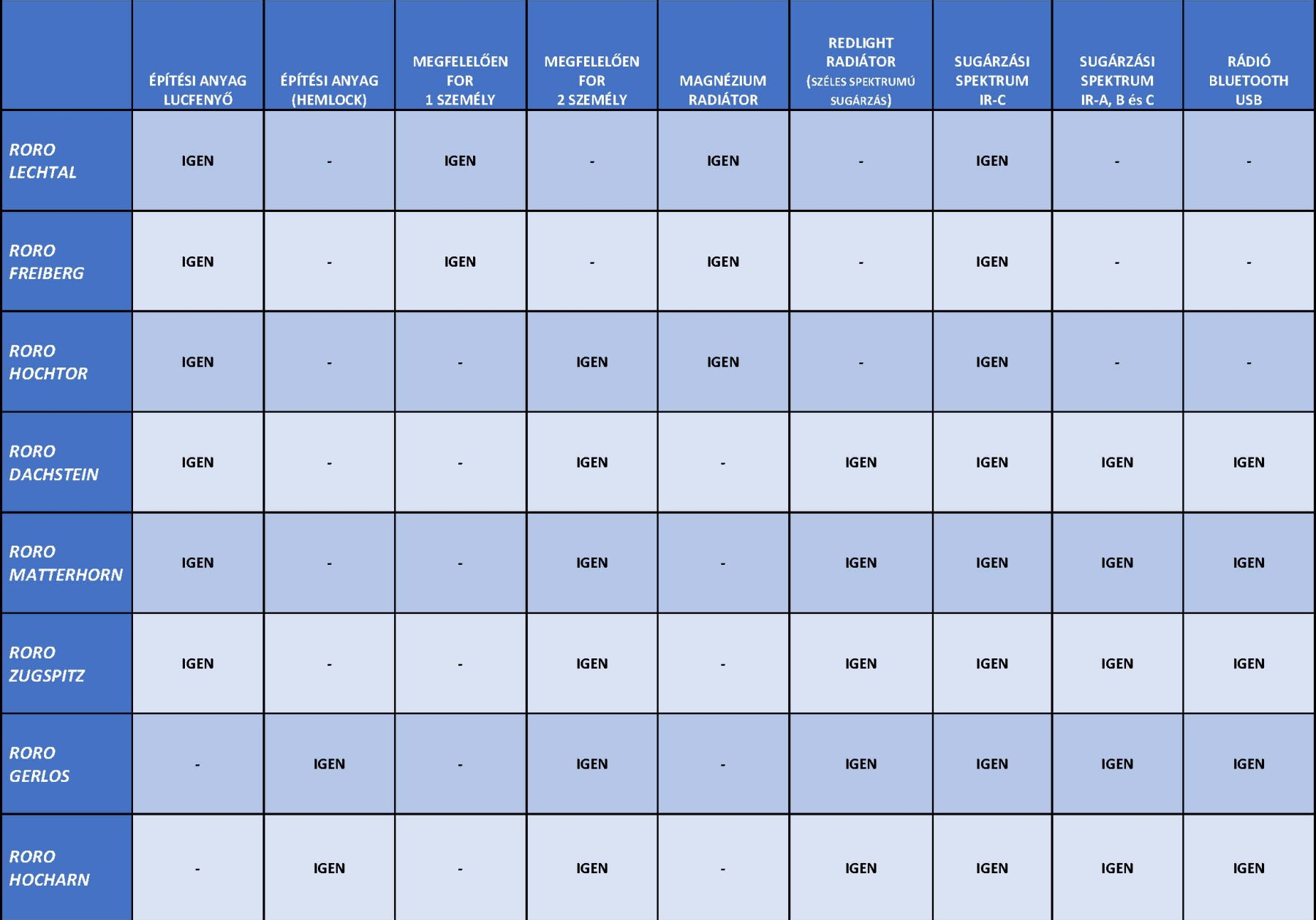 | IR - C | 3000 nm - 1 mm | hatással van a bőrfelületre | általános testmelegítés, méregtelenítés | szaunák és relaxáció, a test általános felmelegítése |
